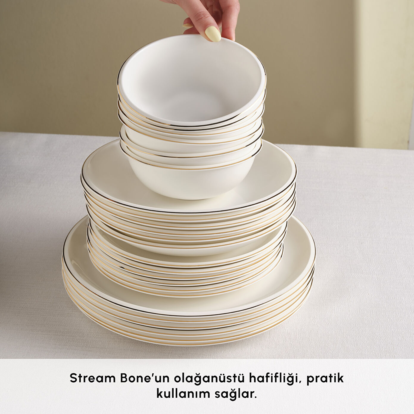 Stream Bone, zarif çizgileri ve ince yapısıyla sadece estetik bir duruş sunmakla kalmaz, aynı zamanda modern sofra sunumlarına yepyeni bir soluk getirir. Gündelik kullanımda da özel davetlerde de rahatlıkla tercih edebileceğiniz bu seri, sadeliğin içindeki dinamizmi yansıtır.