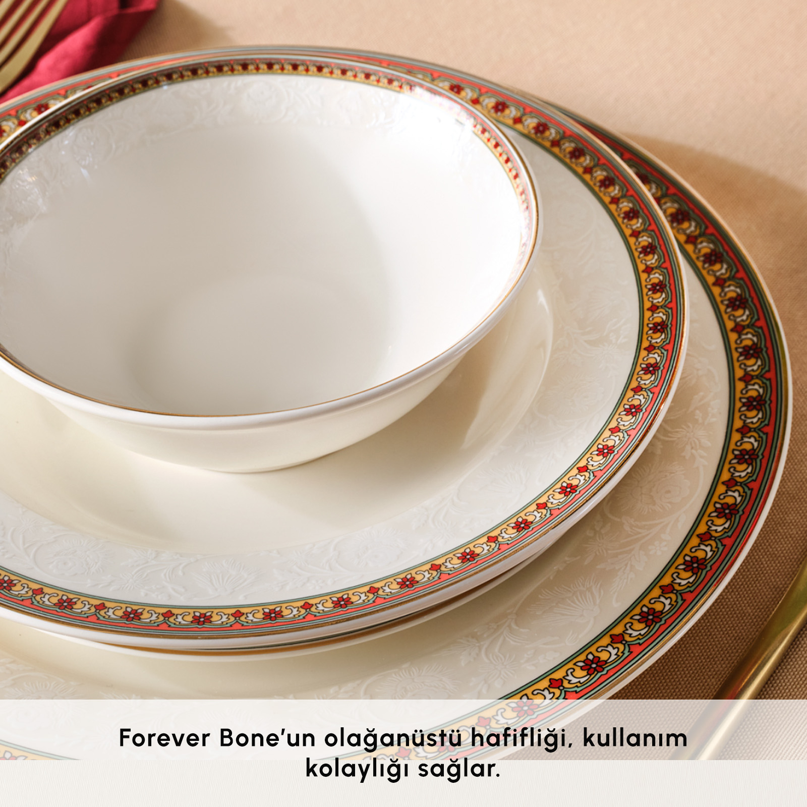 Kemik tozu içeren porselen yapısı sayesinde son derece hafif, aynı zamanda uzun ömürlü ve dayanıklıdır. Hem günlük kullanıma hem de özel davet sofralarına uyum sağlayan bu seri, zarif tasarımı kadar pratikliğiyle de fark yaratır.