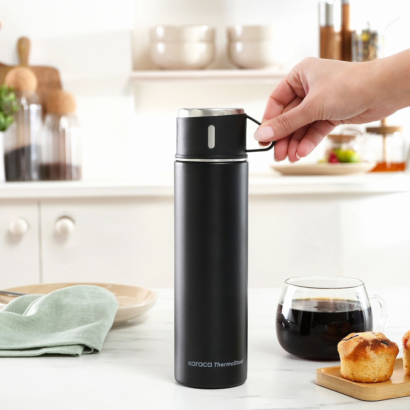 Gün boyu sıcak veya soğuk içeceklerinizin ideal sıcaklığını koruyan Karaca Thermosteel Nature 550 ml Çelik Termos, şık ve ergonomik tasarımıyla her an yanınızda!