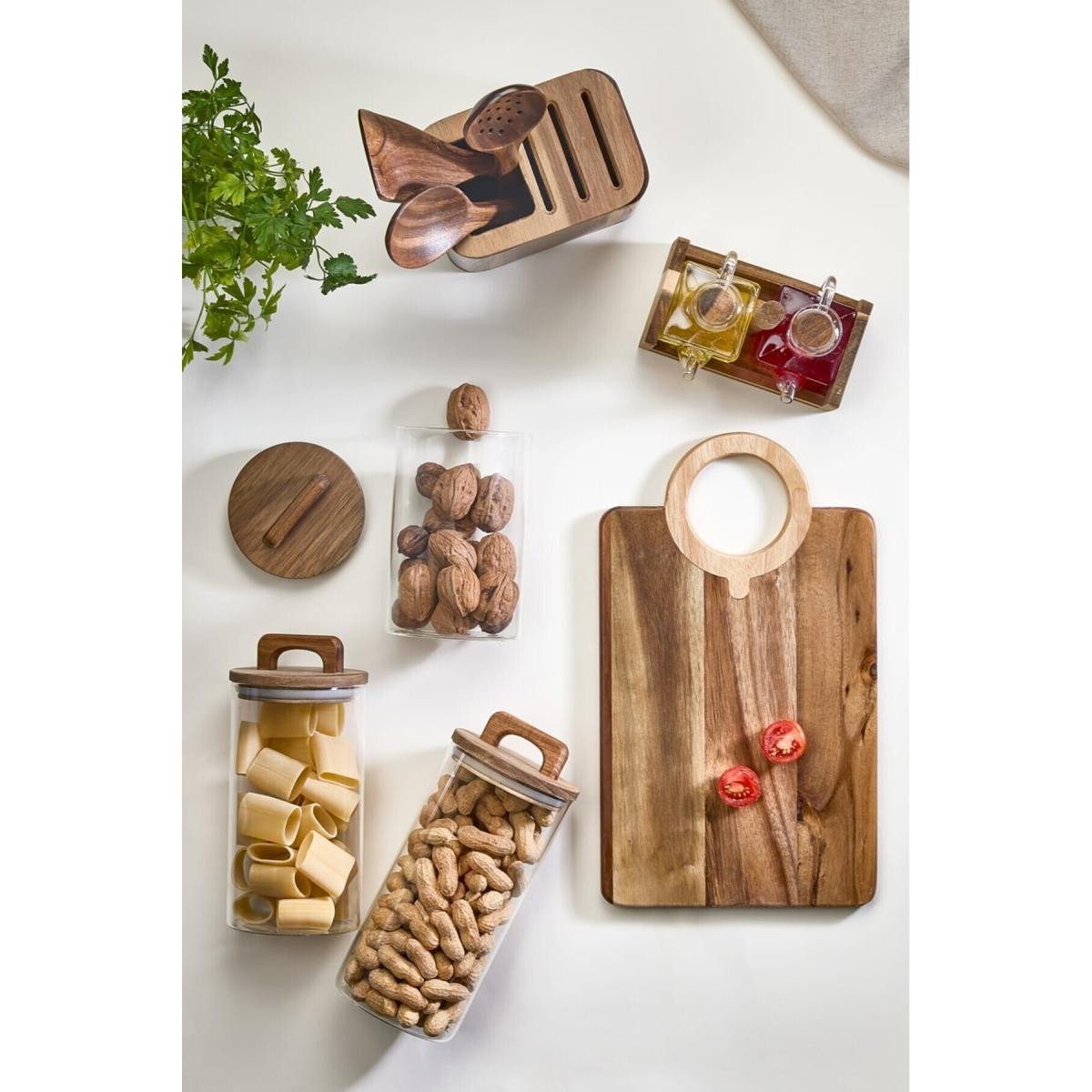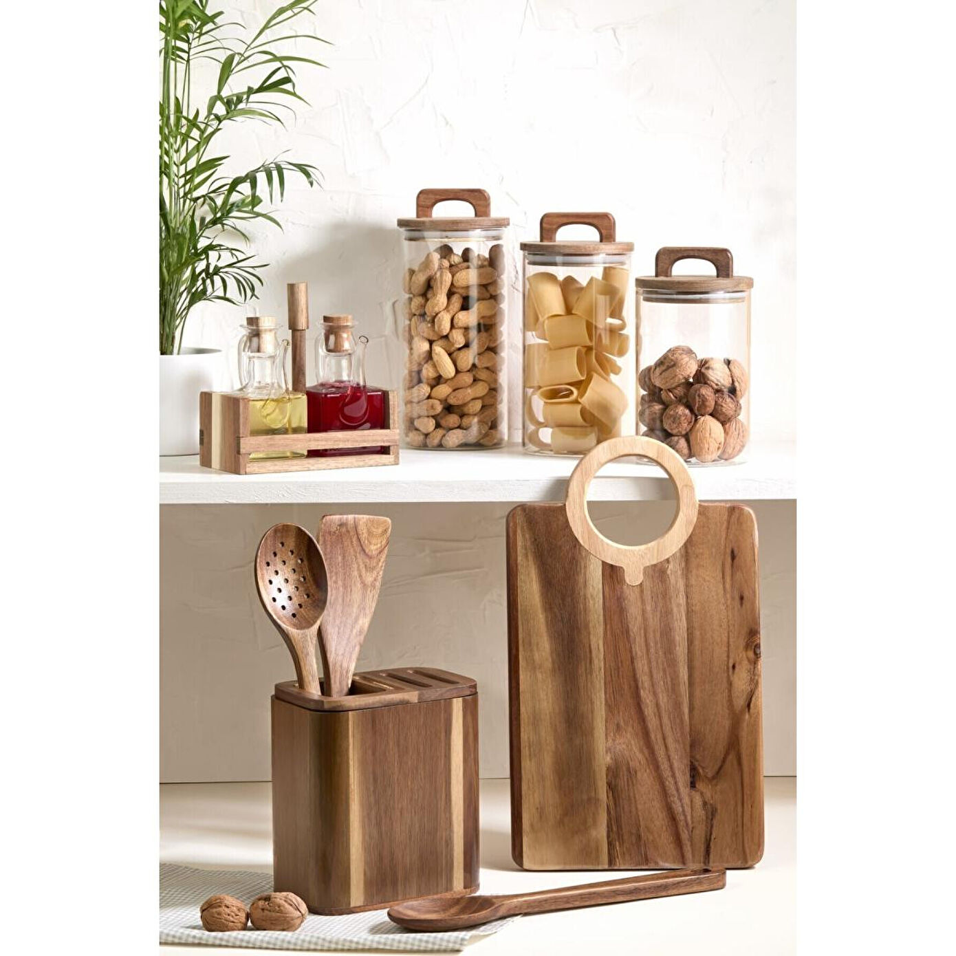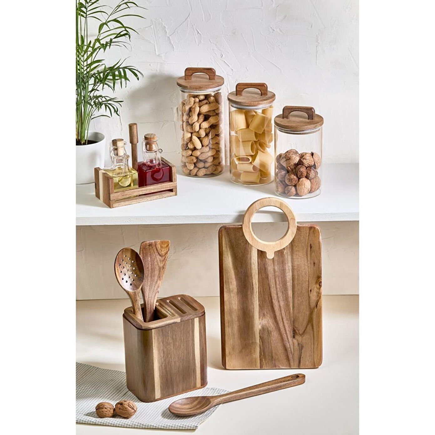 11 Parça Tezgah Üstü Akasya Ahşap Set - Kesme Tahtası, Yağdanlık, Cam Kavanoz, Dik Kaşıklık ve Ahşap Kaşık Seti
