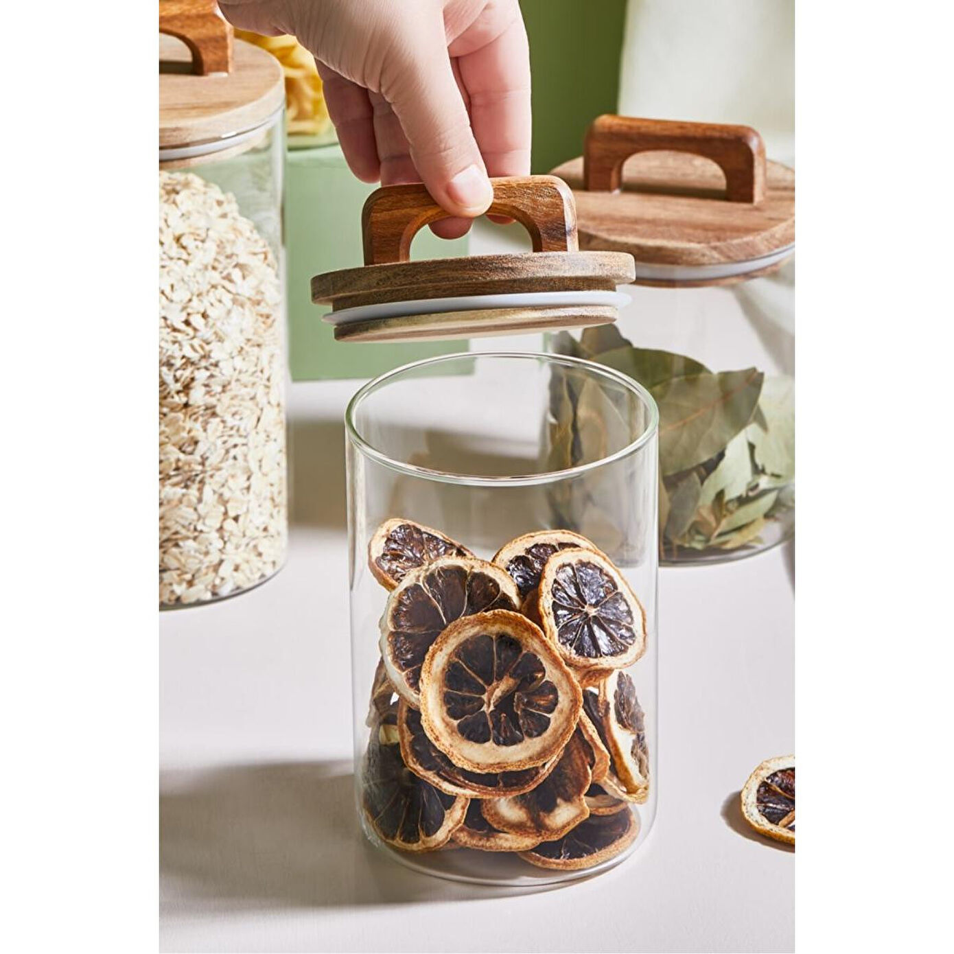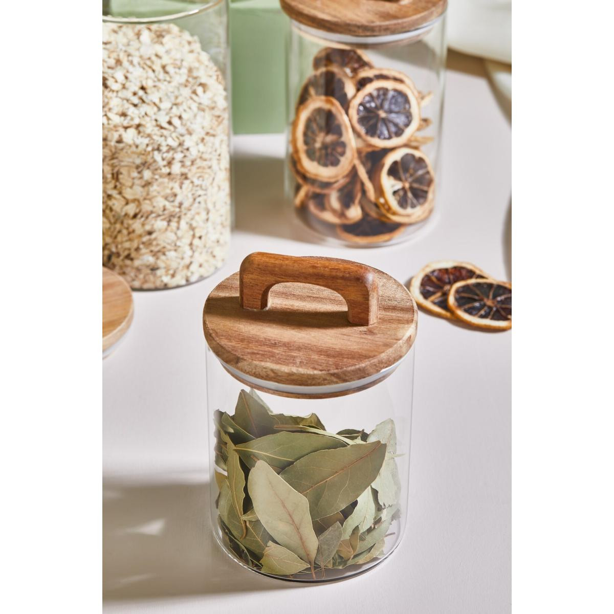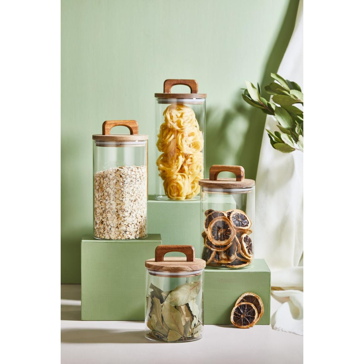 Akasya kapaklar hava geçirmez özellikte olup, gıdalarınızın tazeliğini korur. Her kavanozun üzerinde yer alan ahşap kaşıklar ise kolay kullanım için özel yuvasında yer alır. Cam gövdesi sayesinde içerik rahatça görülebilir, doğal akasya malzeme ise dayanıklıdır.