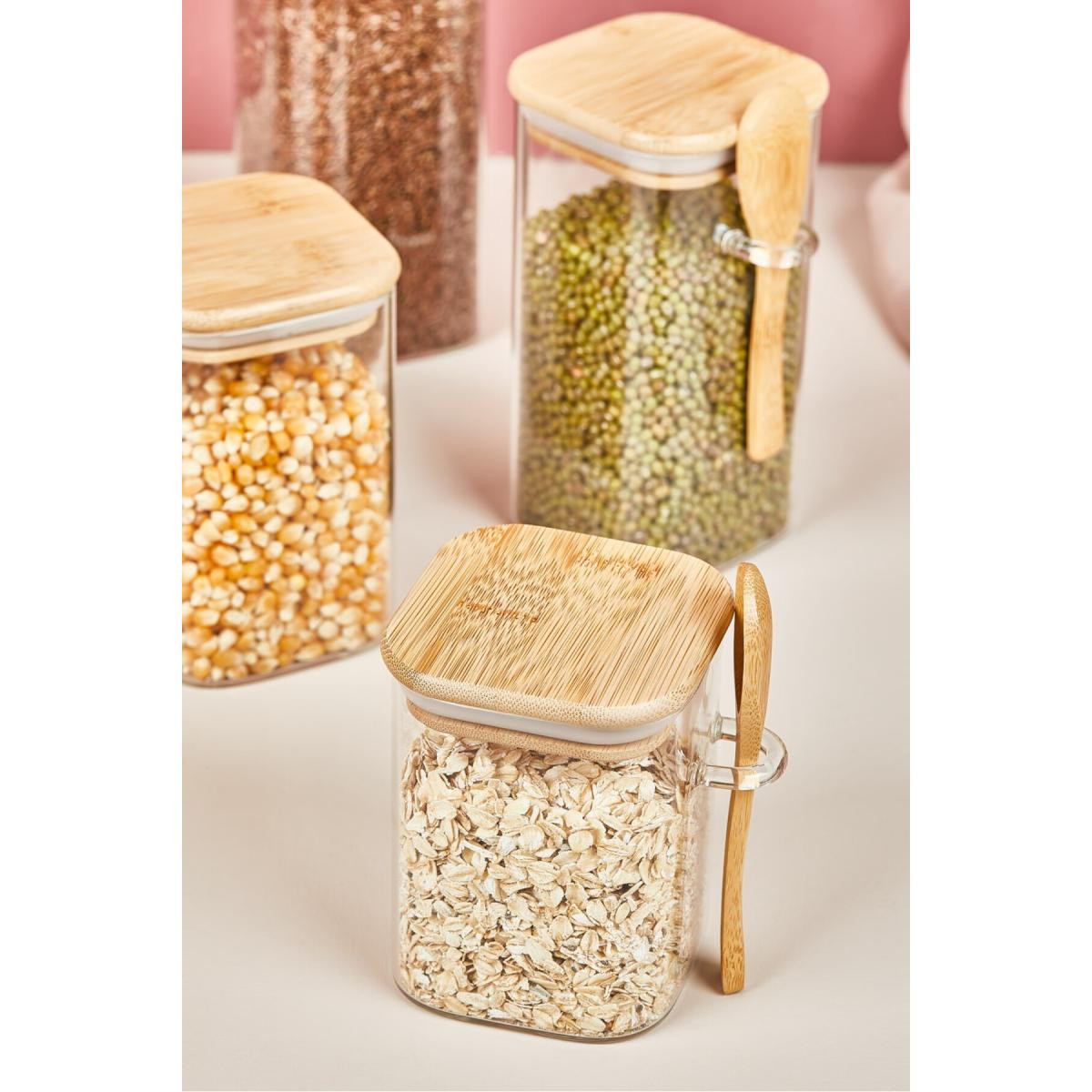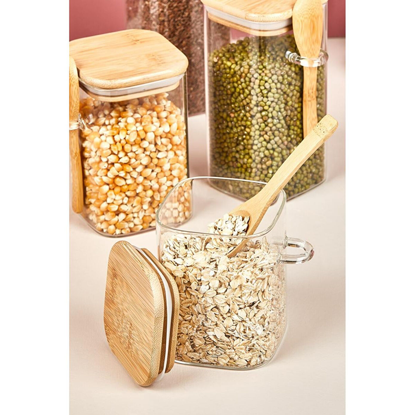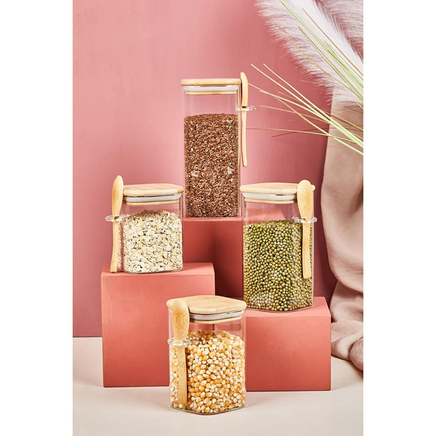 Lora Bianca 4' Lü Bambu Vakumlu Kapaklı & Kaşıklı Cam Kavanoz - Erzak/bakliyat Saklama Kabı Seti Beyaz