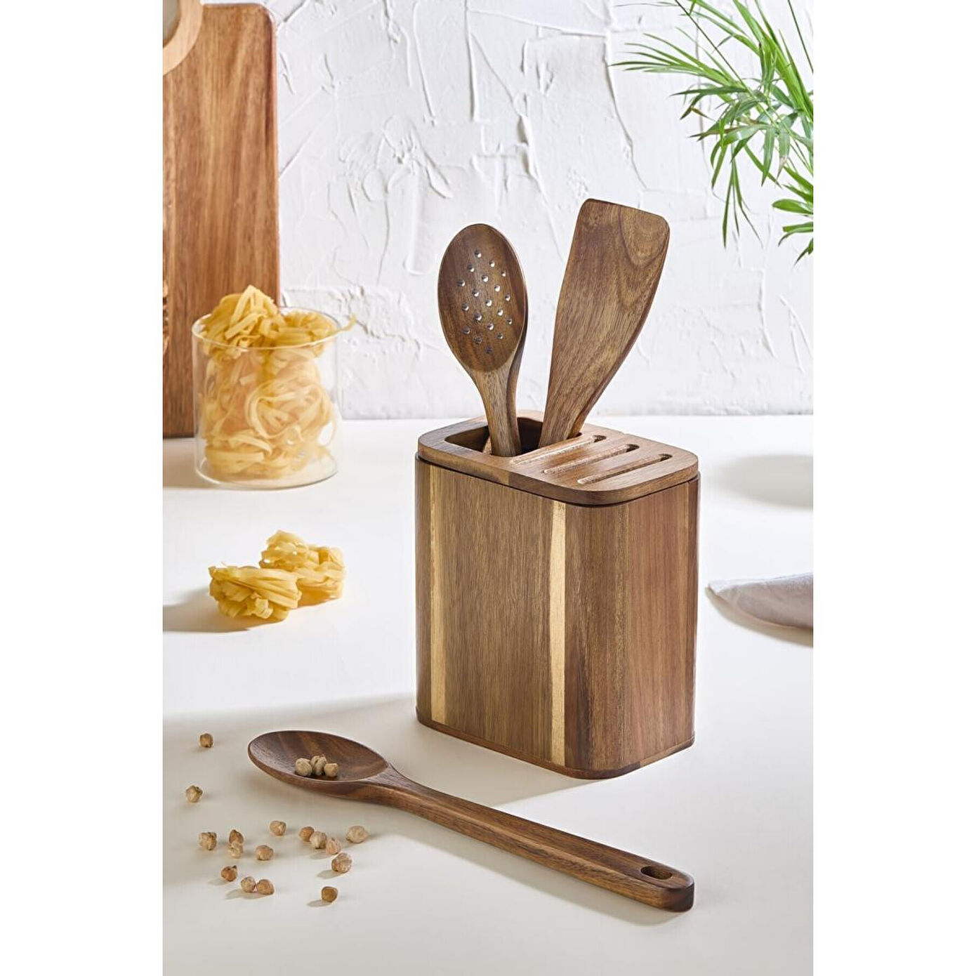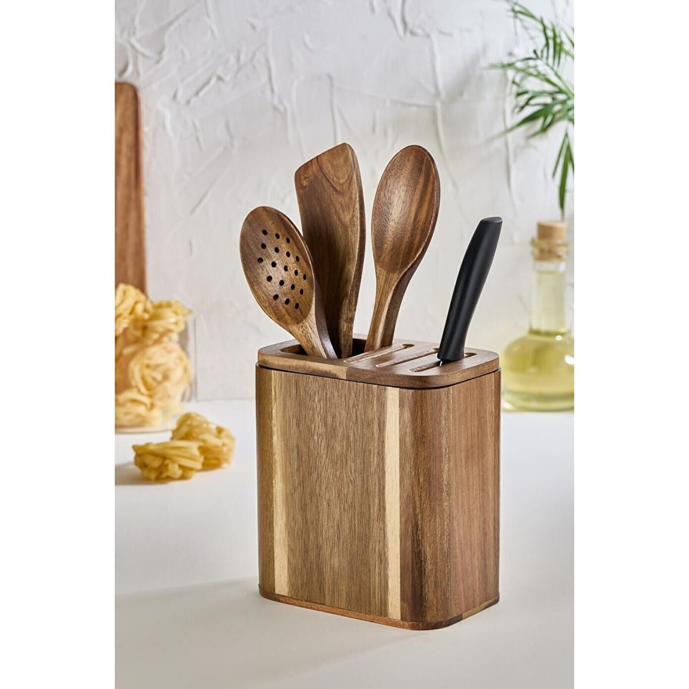 Lora Bianca'nın sizin için seçtiği Akasya Ahşap Tezgah Üstü Kaşıklık - Bıçaklık Düzenleyici ve Kaşık Seti, mutfaklarınıza hem düzen hem de estetik bir dokunuş katıyor. Bu set, mutfak gereçelerinizi düzenli bir şekilde saklamanızı sağlarken aynı zamanda şık bir görünüm sunar.