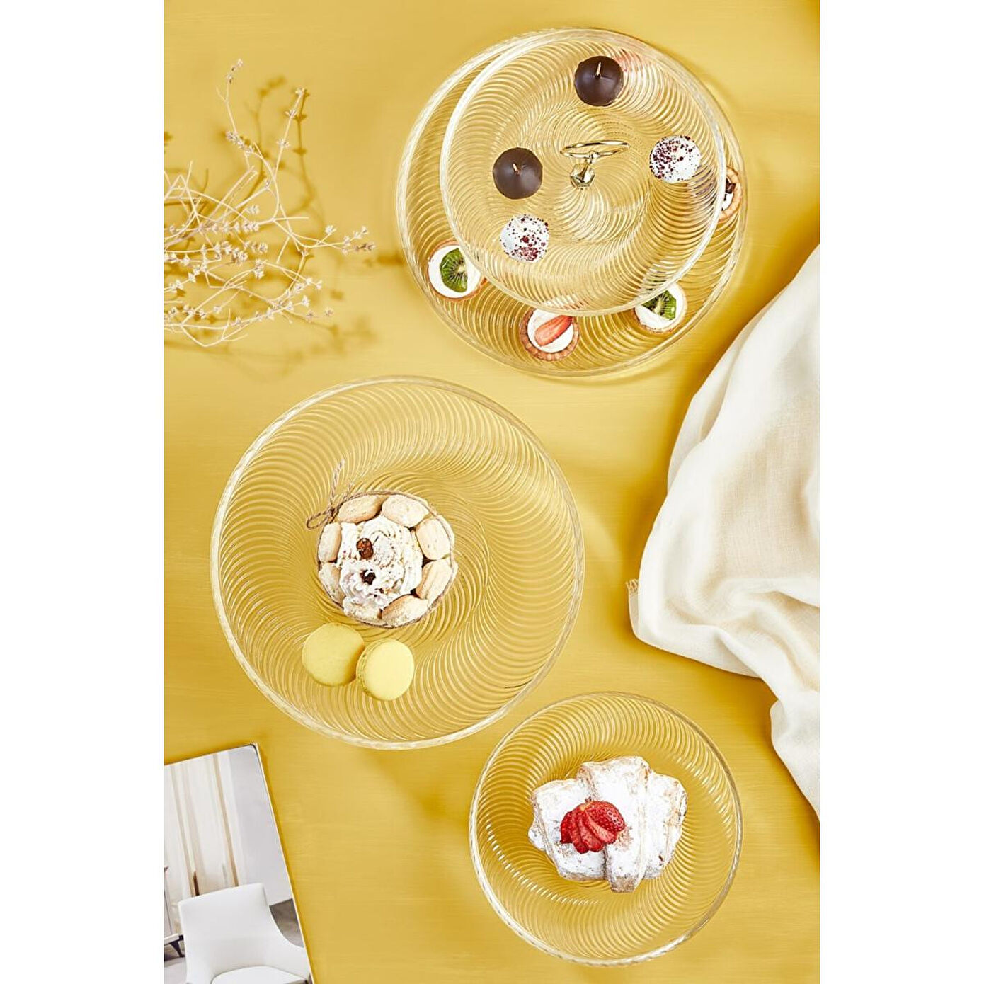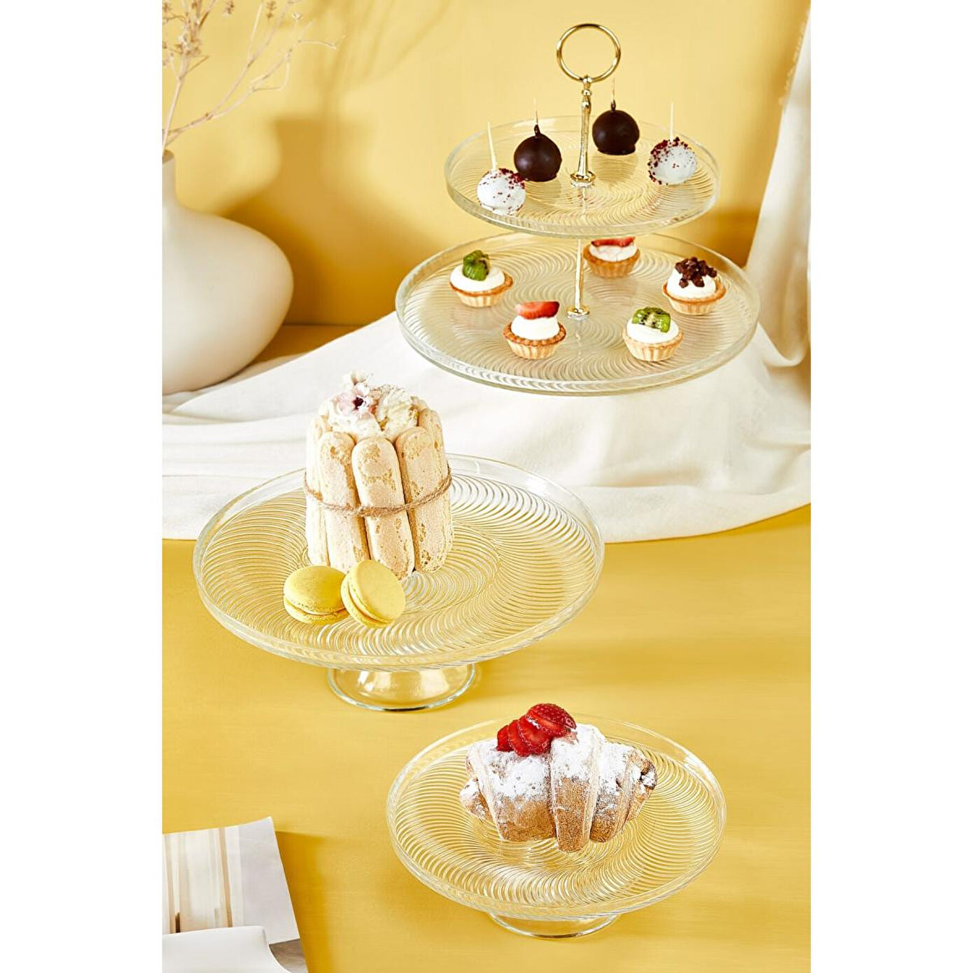 1 adet 28 cm ayaklı stand, 1 adet 21 cm ayaklı stand1 adet 28 cm ve 21 cm katlı stand (alt parça, üst parça ve birleştirme aparatı dahil)Tamamen şeffaf cam tasarımPasta, kek ve tatlı sunumlarınızı sade bir zarafetle sergilemek için idealDayanıklı cam malzemeBulaşık makinesinde yıkanmaya uygunPaket İçeriği: