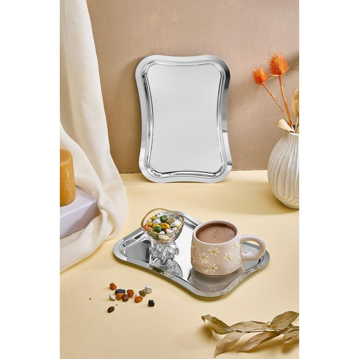 Lora Bianca Dikdörtgen Paslanmaz Çelik 6’lı Gümüş Kahve, Çay, Dekoratif Sunum Servis Nişan Tepsisi Gümüş
