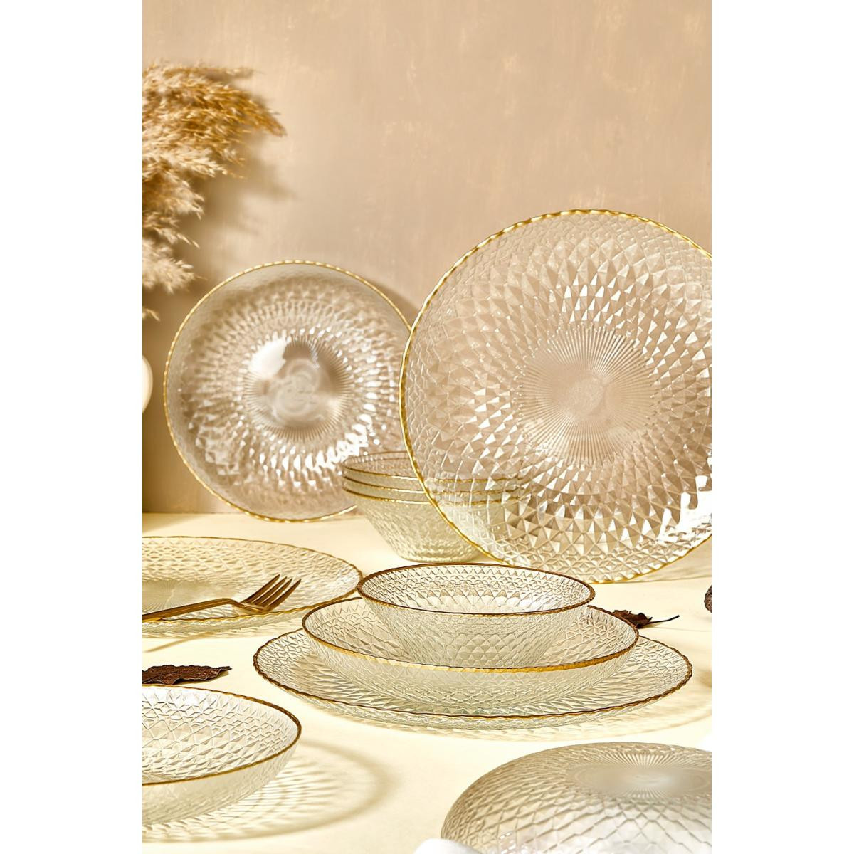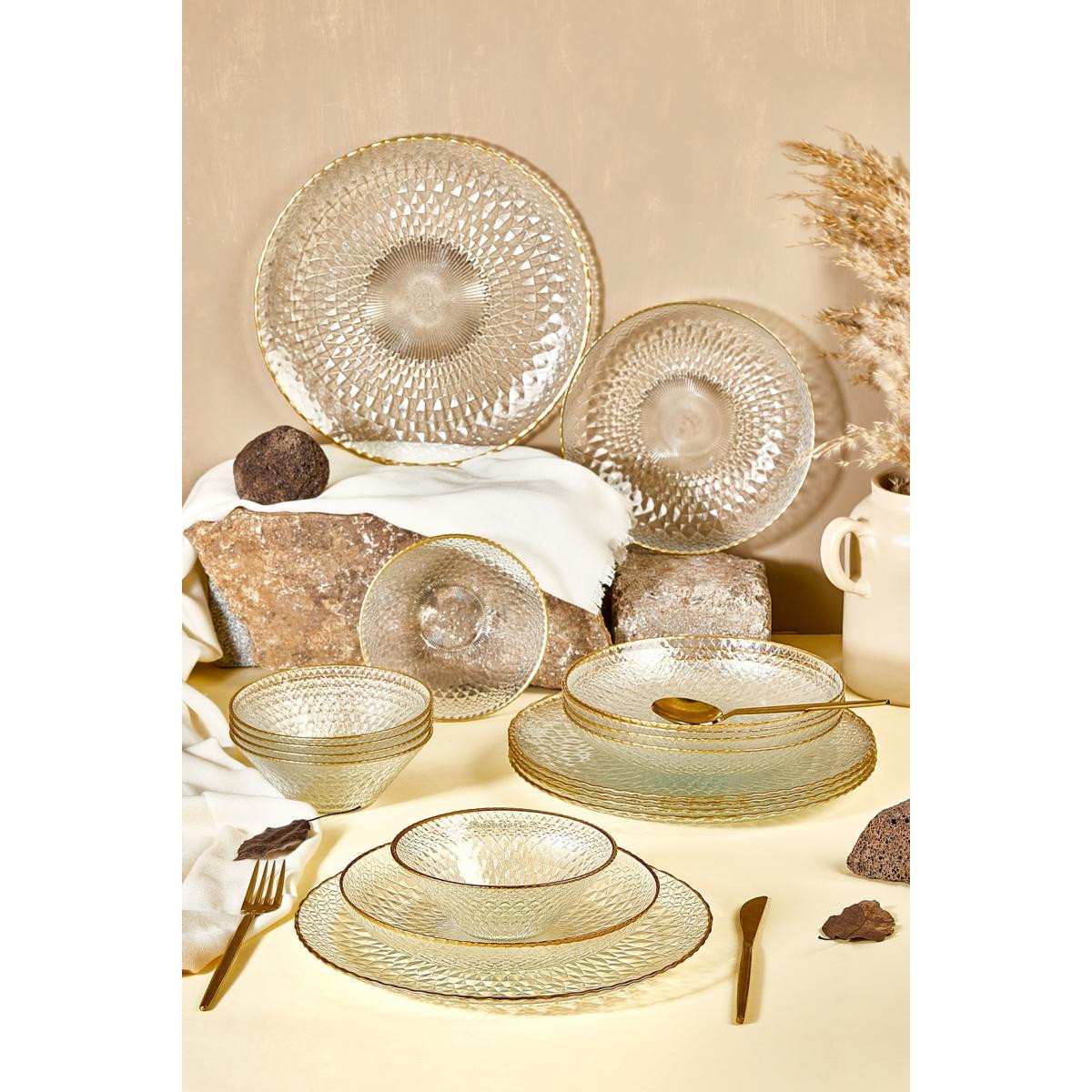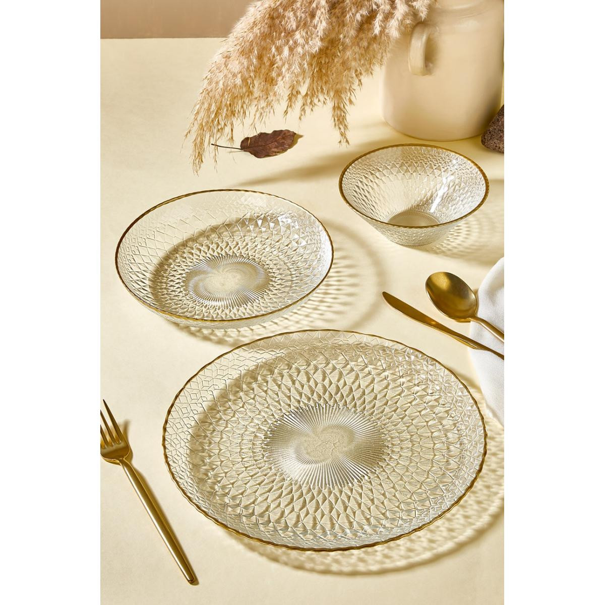 Şeffaf cam ve altın rim desenleriyle sofistike bir görünüm6 kişilik kullanım için ideal setServis, yemek tabakları ve çorba kaselerinden oluşan kapsamlı setÖzel davetlerden günlük sofralara her ortamda kullanılabilirAltın rim detaylarıyla lüks bir dokunuş sunarDayanıklı ve uzun ömürlü cam malzemeLora Bianca Fugi 18 Parça Yemek Takımı, sofralarınıza estetik bir dokunuş katarak her anı daha özel hale getirir. Altın rim desenleriyle şıklığı vurgulayan bu set, özel misafirlerinizi ağırlarken ya da günlük öğünlerinizi güzelleştirirken ideal bir tercihtir. Hem işlevselliği hem de göz alıcı tasarımıyla yemek keyfinizi bir üst seviyeye taşıyın.