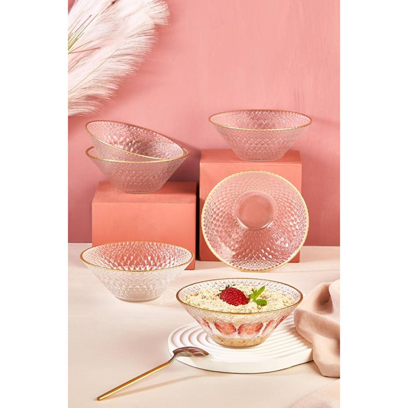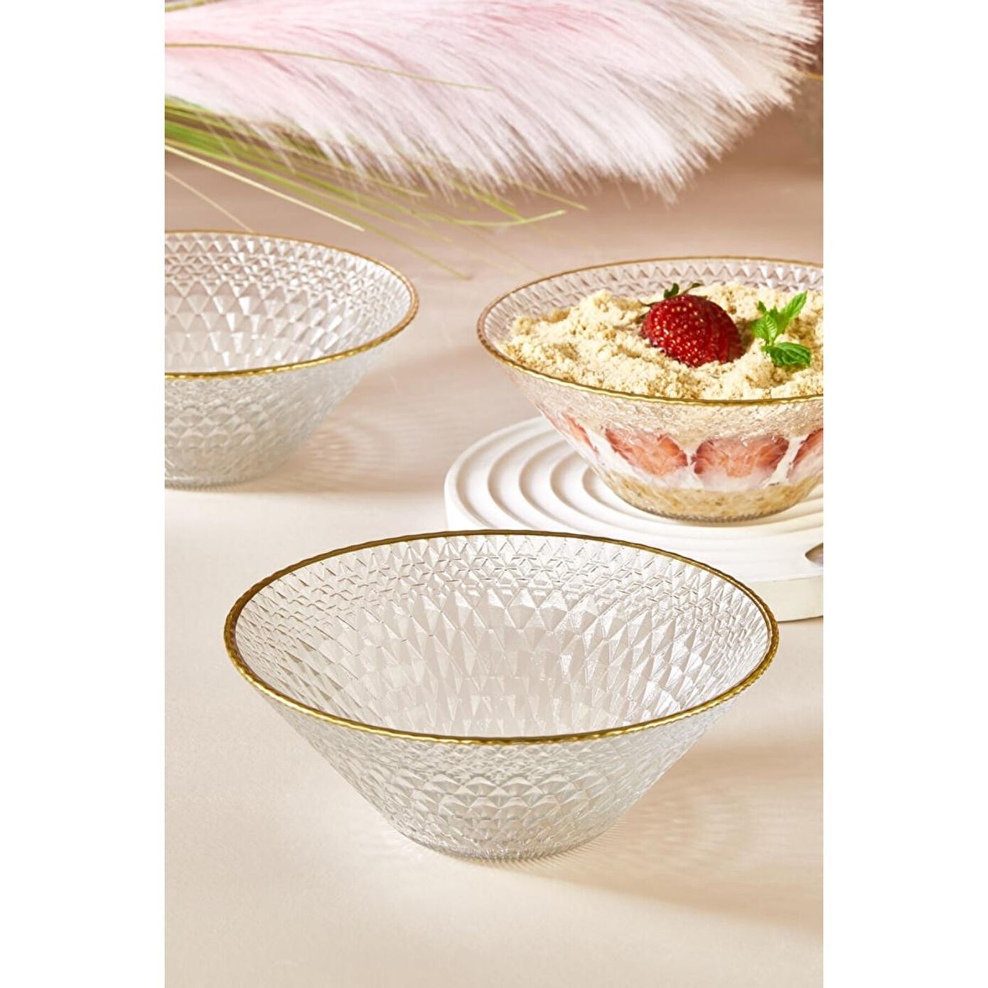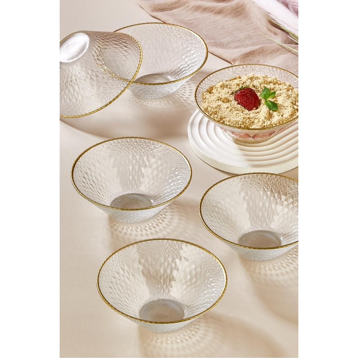 Altın rim detayları, camın şeffaflığıyla birleşerek, sofralarınıza sofistike bir dokunuş katar. Tatlılarınız, atıştırmalıklarınız ve küçük yemekleriniz için mükemmel bir sunum sağlar. Kaliteli cam malzemesiyle hem dayanıklı hem de uzun ömürlü olan bu set, her türlü yemek sunumunuza zarif bir hava katar.