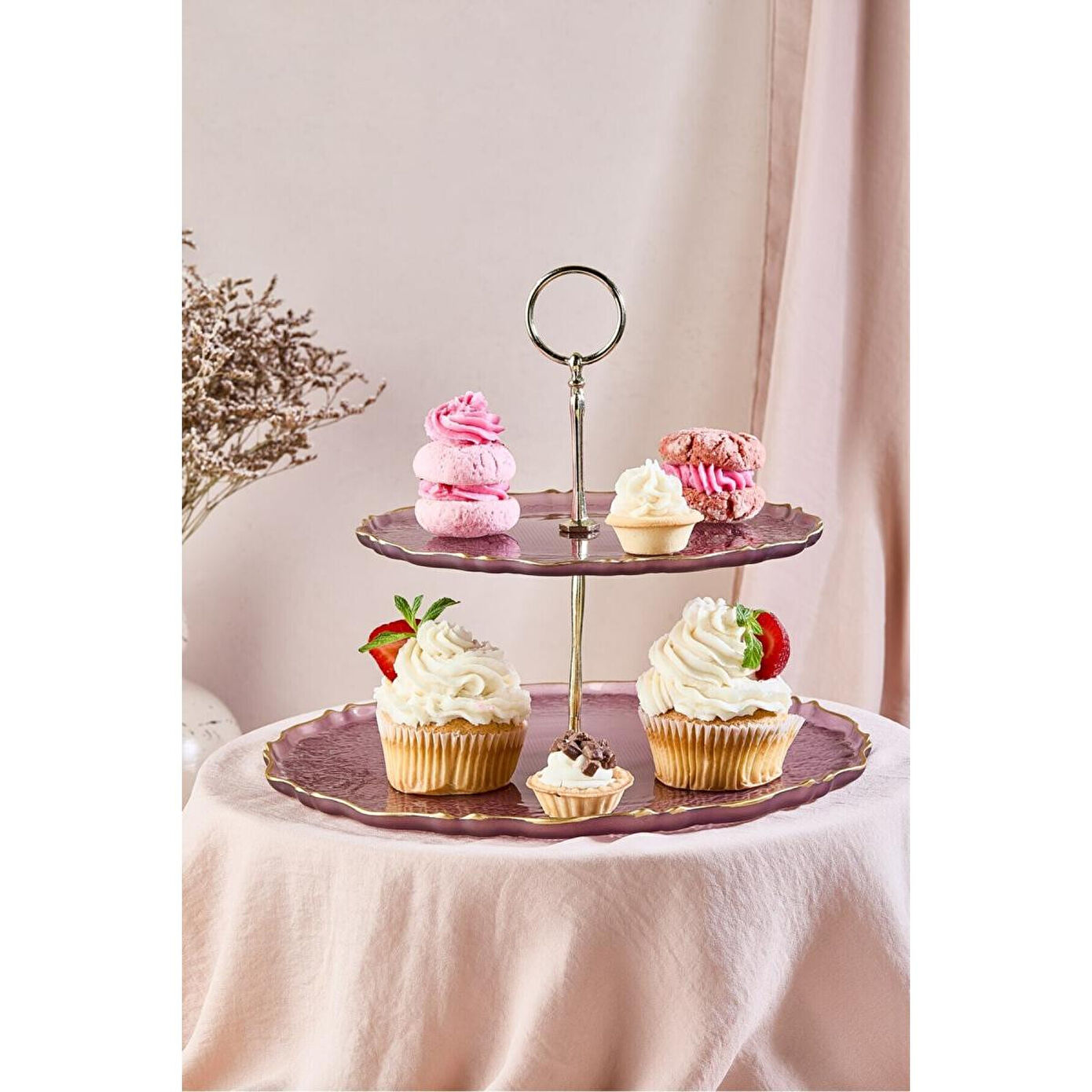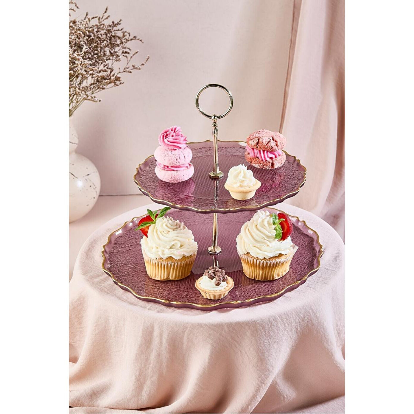 Özel günlerinizin asaletini yansıtan bu iki katlı mürdüm cam sunum şaheseri, Lora Bianca'nın titiz işçiliğiyle tasarlandı. Derin mürdüm rengi cam gövdesi ve 24 ayar gold rim detaylarıyla dikkat çeken bu stand, sofralarınıza lüks bir dokunuş katıyor.