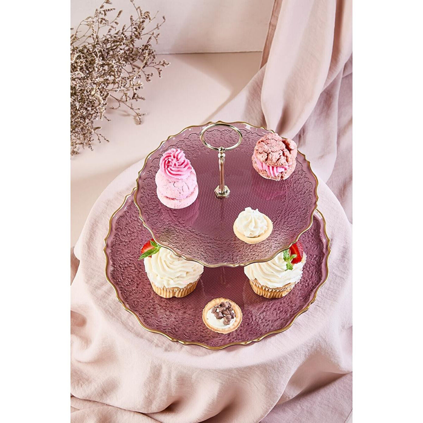 Lora Bianca Goblen Mürdüm Renk 2 Katlı Lüks Cam Pasta/Kurabiyelik/Şekerlik Sunum Standı