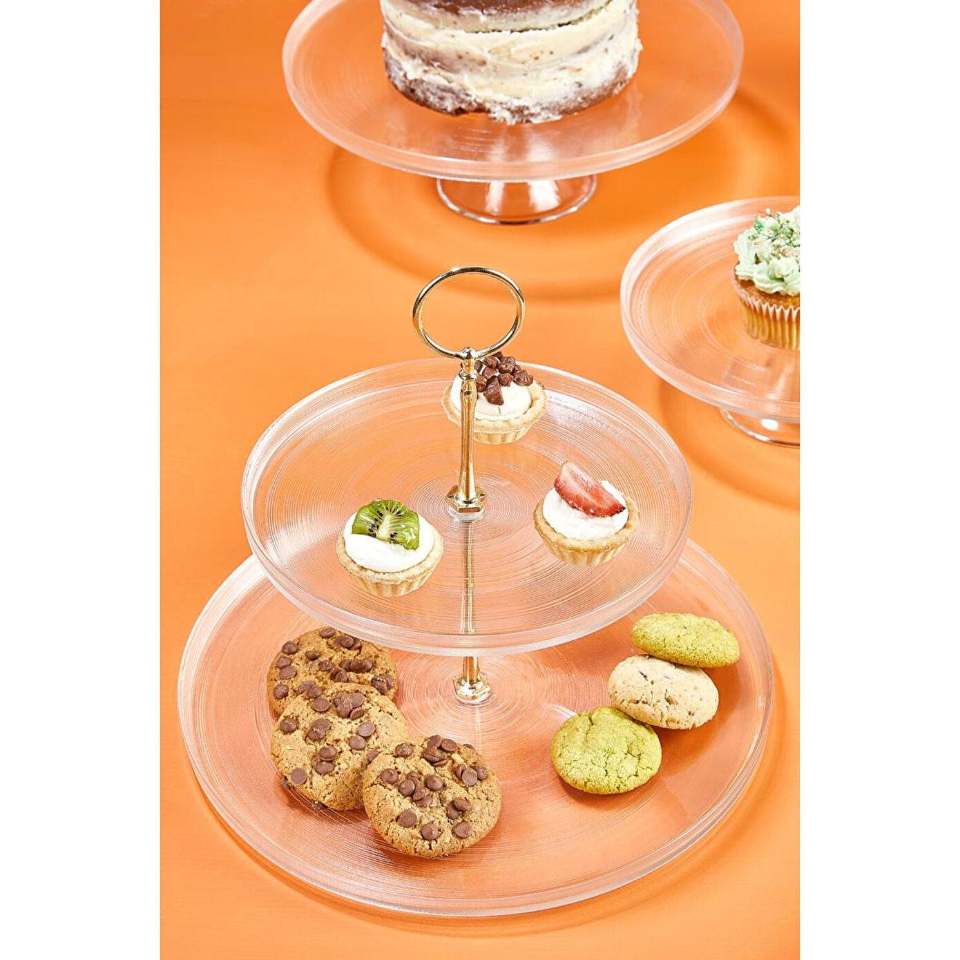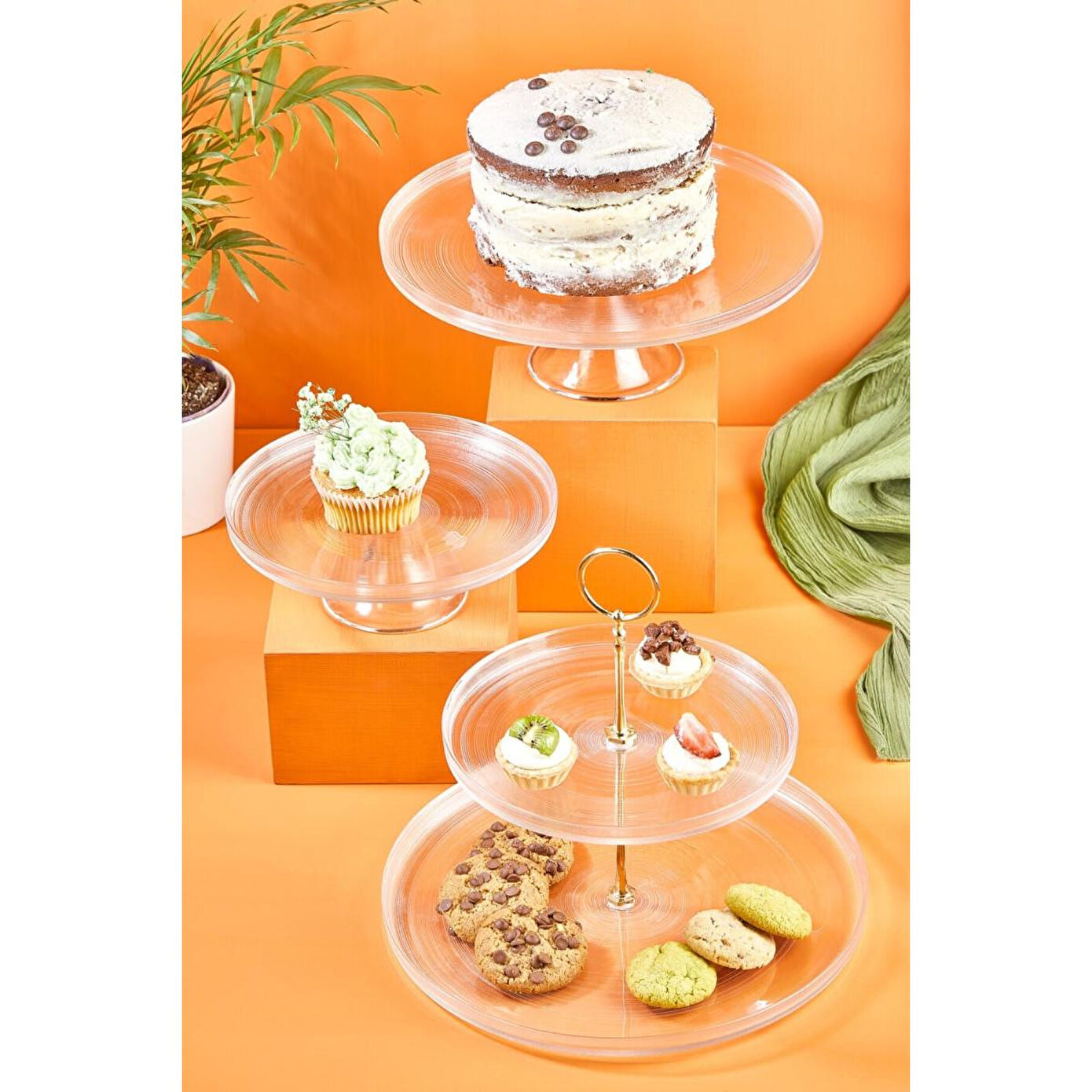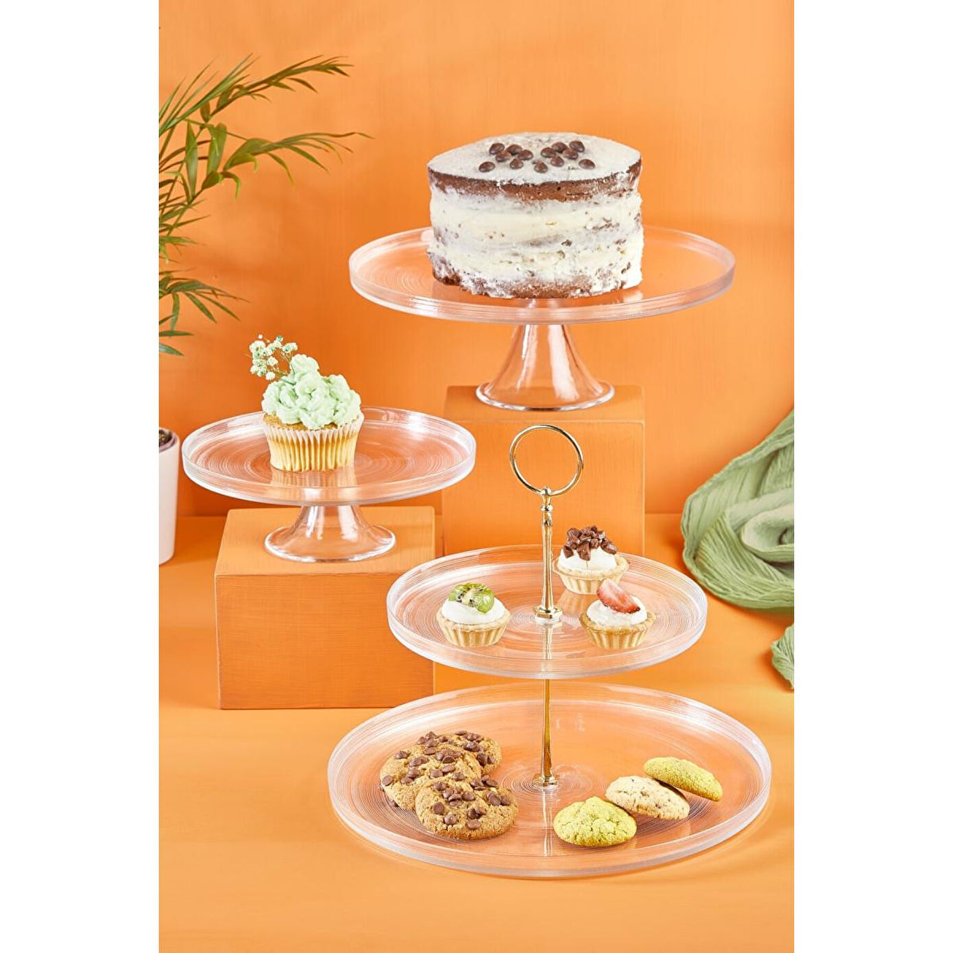 1 adet 28 cm ayaklı stand, 1 adet 21 cm ayaklı stand1 adet 28 cm ve 21 cm katlı stand (alt parça, üst parça ve birleştirme aparatı dahil)Şeffaf cam tasarımıyla her ortama uyum sağlarPasta, kek ve tatlı sunumlarınız için sade bir zarafet sunarDayanıklı ve uzun ömürlü cam malzemeBulaşık makinesinde yıkanmaya uygunPaket İçeriği: