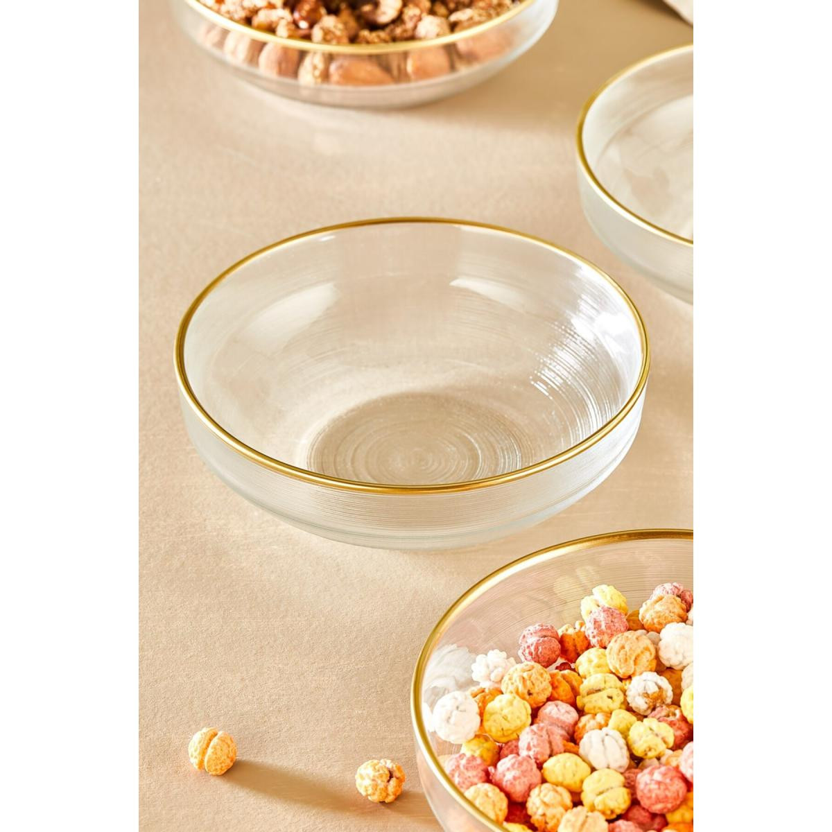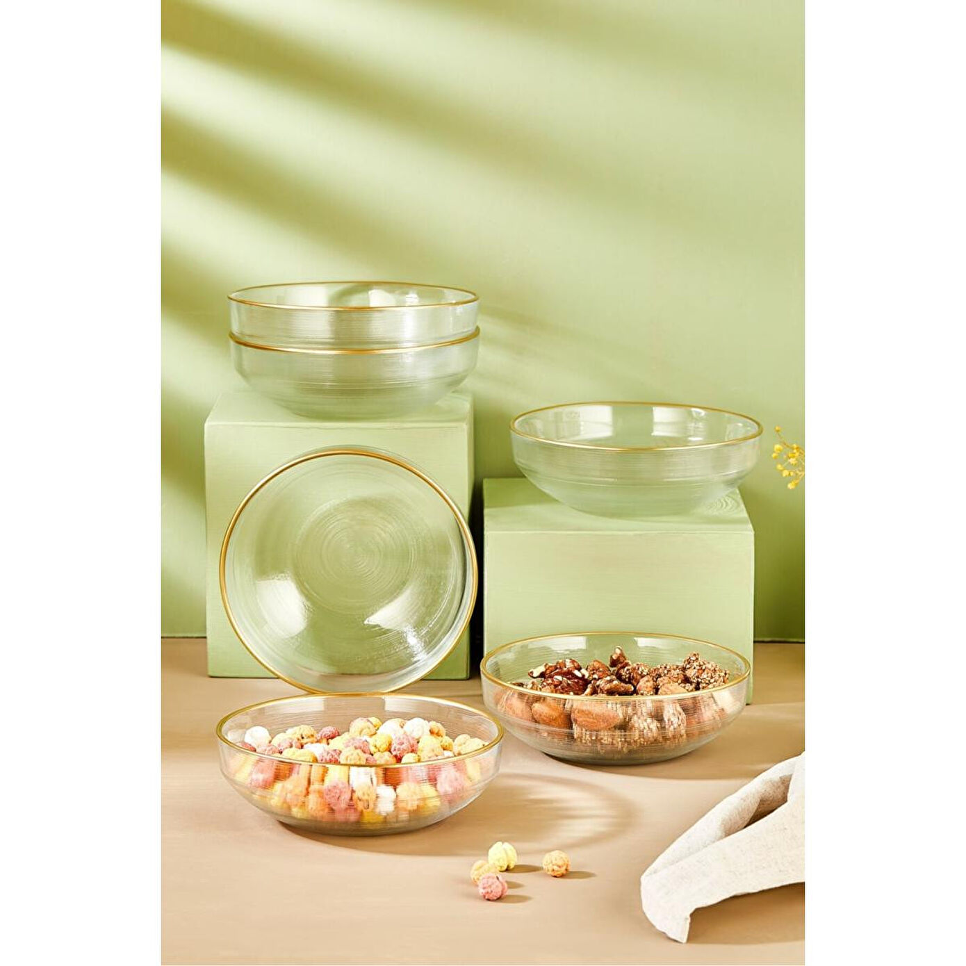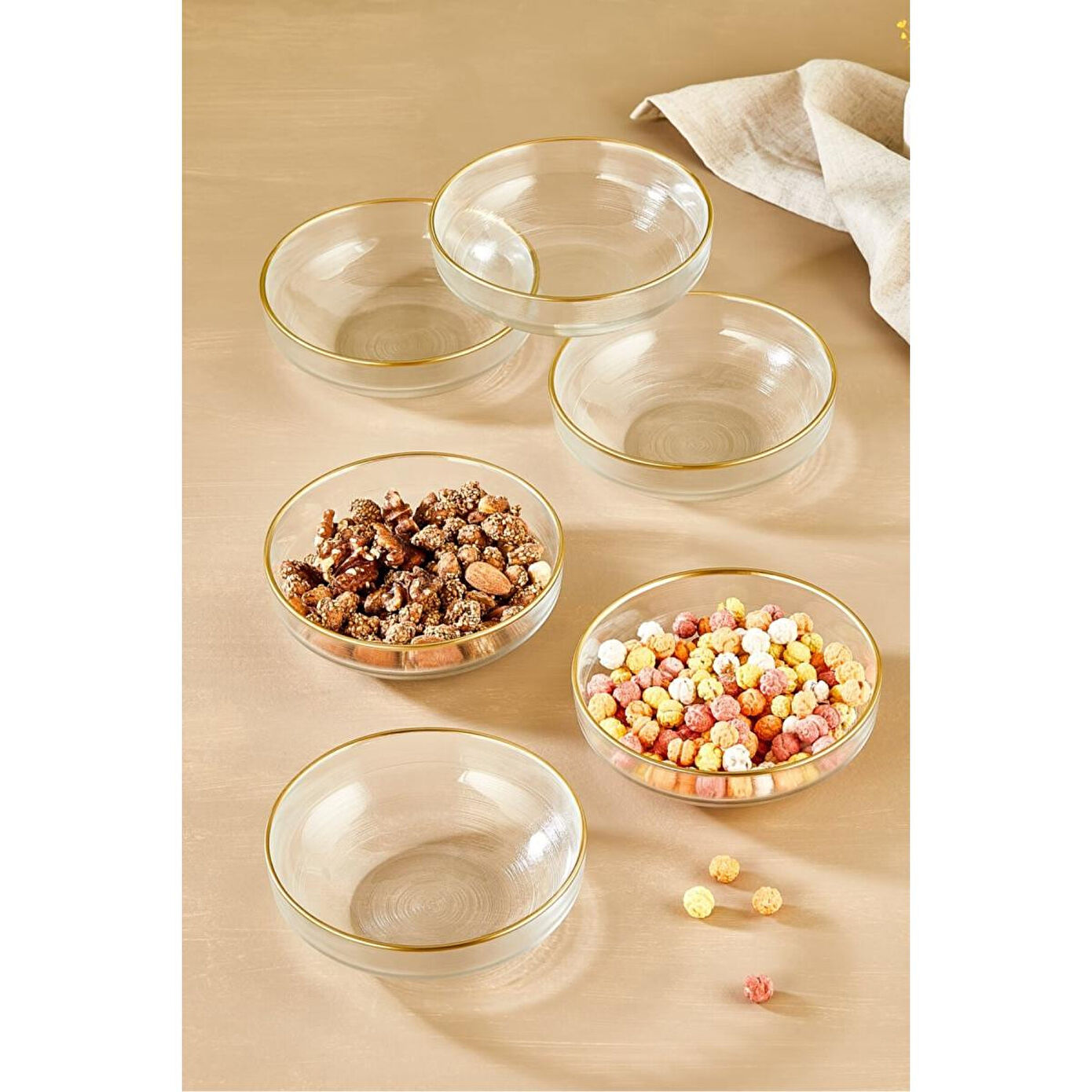 Altın rim detayları, camın şeffaflığıyla birleşerek, sofralarınıza sofistike bir dokunuş katar. Tatlılarınız, atıştırmalıklarınız ve küçük yemekleriniz için mükemmel bir sunum sağlar. Kaliteli cam malzemesiyle hem dayanıklı hem de uzun ömürlü olan bu set, her türlü yemek sunumunuza zarif bir hava katar.