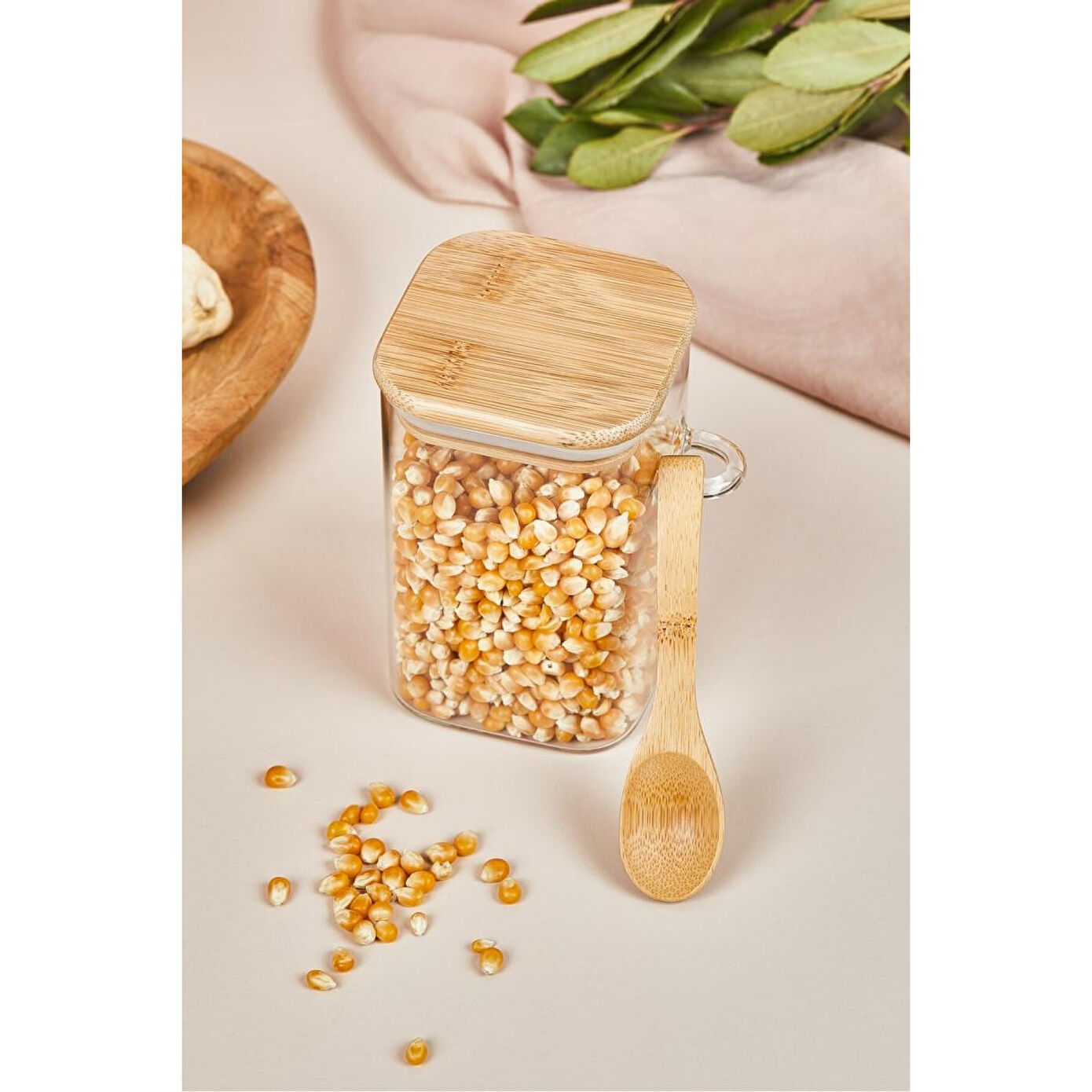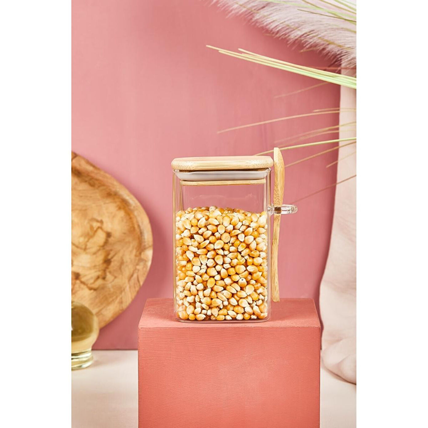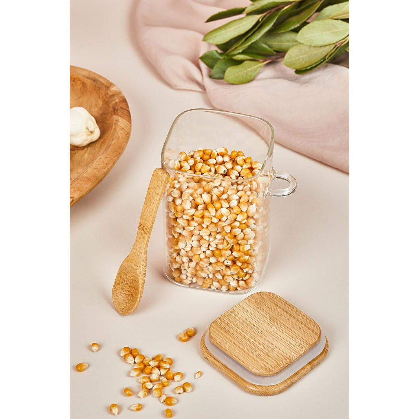 Bu çok amaçlı kavanoz; bakliyatlarınızı, kuru gıdalarınızı ya da baharatlarınızı tazeliğini koruyarak saklamanıza yardımcı olur. Hava geçirmez bambu kapağı sayesinde, içindeki yiyecekler uzun süre taze kalır. Kavanozun üzerinde yer alan kaşık yuvası ise pratik bir kullanım sunar; ölçü ve servis işlerinizi kolaylaştırır.