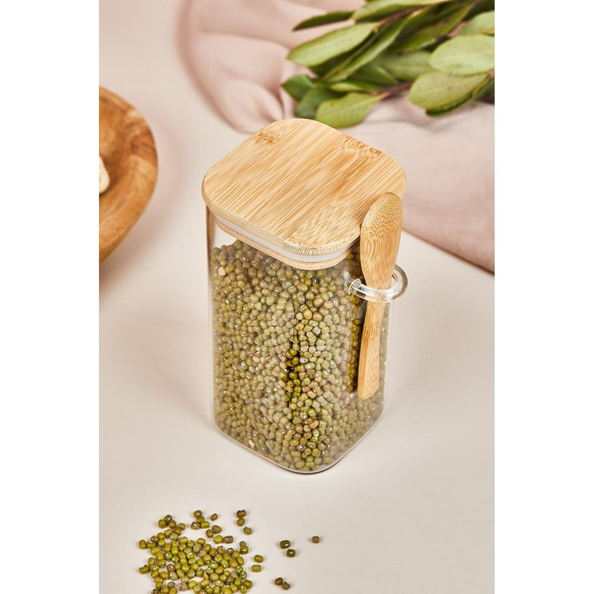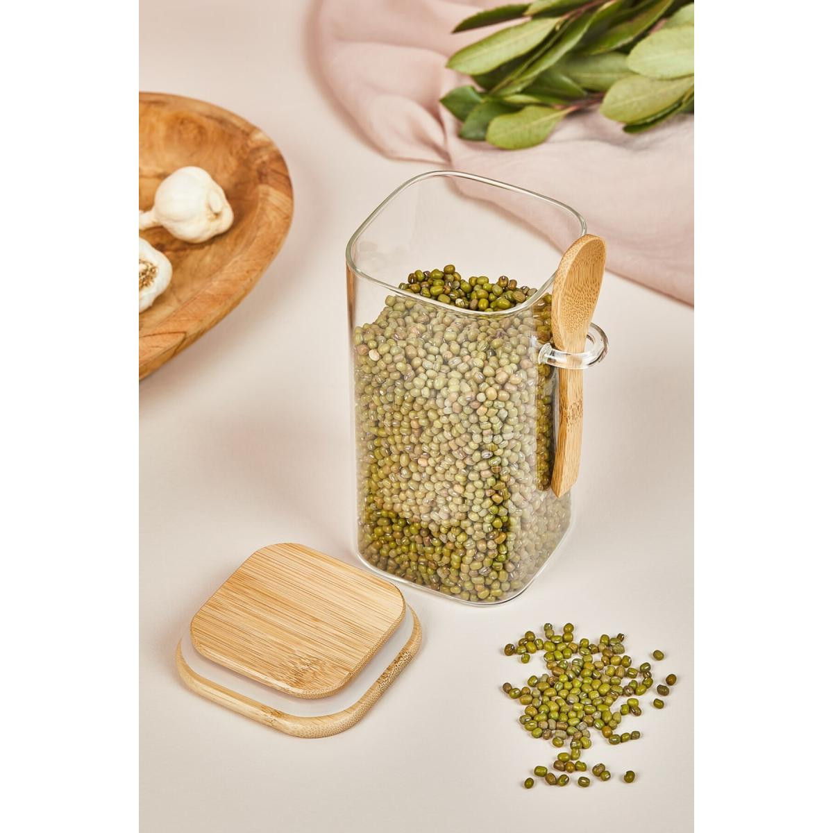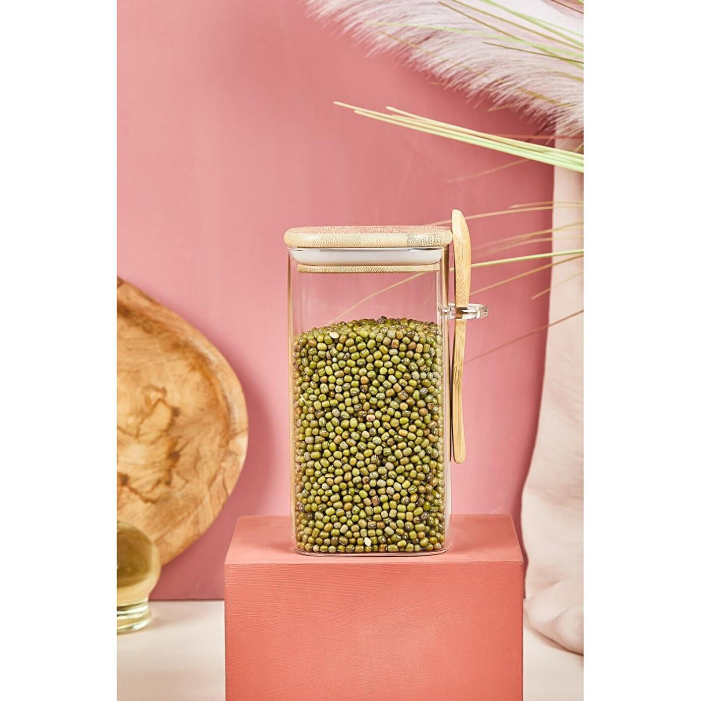 Bu çok amaçlı kavanoz; bakliyatlarınızı, kuru gıdalarınızı ya da baharatlarınızı tazeliğini koruyarak saklamanıza yardımcı olur. Hava geçirmez bambu kapağı sayesinde, içindeki yiyecekler uzun süre taze kalır. Kavanozun üzerinde yer alan kaşık yuvası ise pratik bir kullanım sunar; ölçü ve servis işlerinizi kolaylaştırır.
