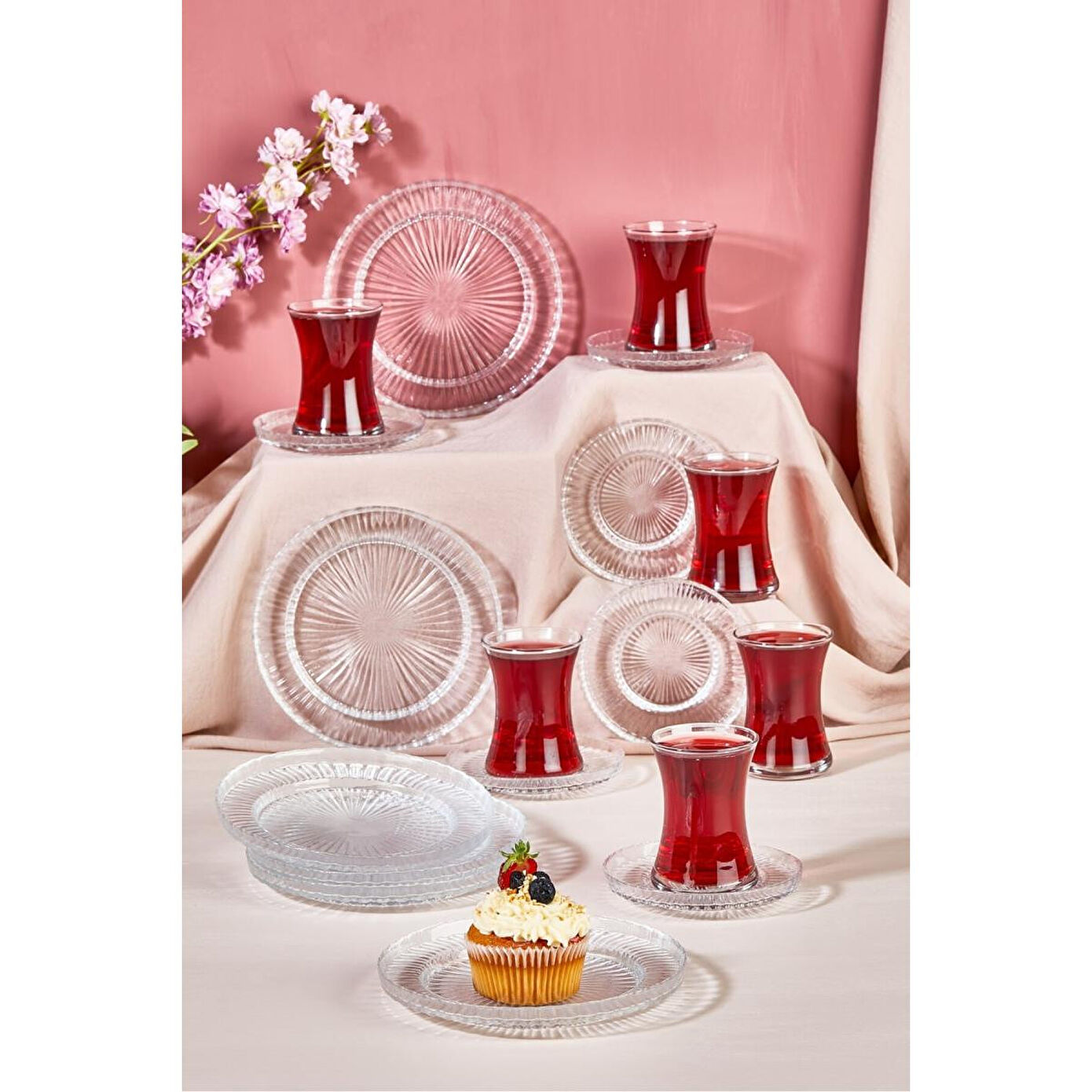 6 adet çay bardağı6 adet çay tabağı6 adet pasta/tatlı tabağı (17 Cm.)Toplam 18 parçadan oluşan bu set, çay saatlerinizi hem estetik hem de fonksiyonel bir deneyime dönüştürür. Camın şeffaf ve zarif yapısı, altın rim veya modern çizgileriyle her sunumu daha etkileyici hale getirir.