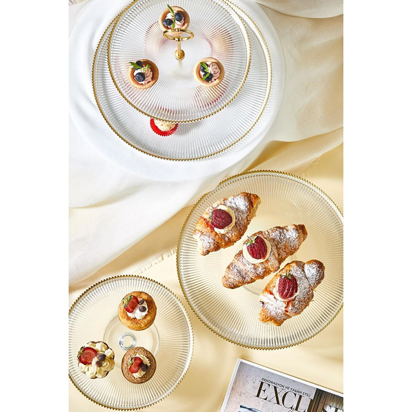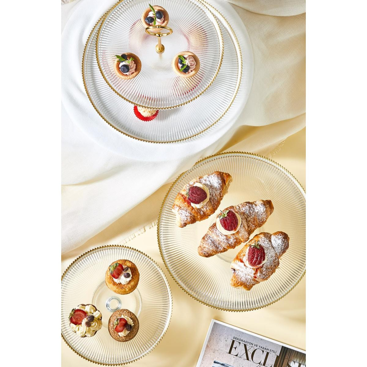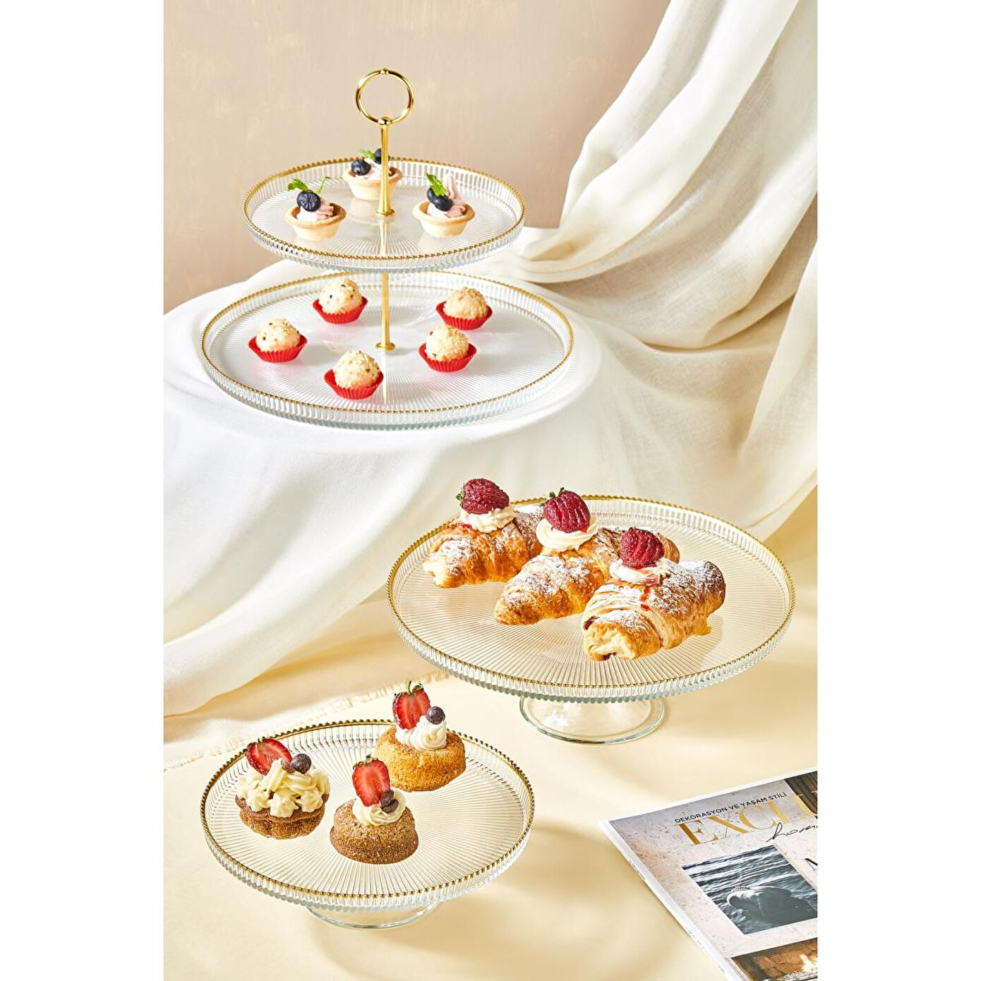 Setin içinde, 1 adet 28 cm ve 1 adet 21 cm ayaklı stand ile birlikte, 21 cm ve 28 cm katlı stand ve birleştirme parçası bulunuyor. Toplamda 5 parçadan oluşan bu set, farklı boyutlardaki tatlı, kek ve pastalarınızı görsel olarak etkileyici bir şekilde sunmanızı sağlar. Katlı stand, farklı yüksekliklerde sunum yapmanıza imkan tanırken, altın rim detayları ile sunumlarınıza sofistike bir dokunuş ekler.
