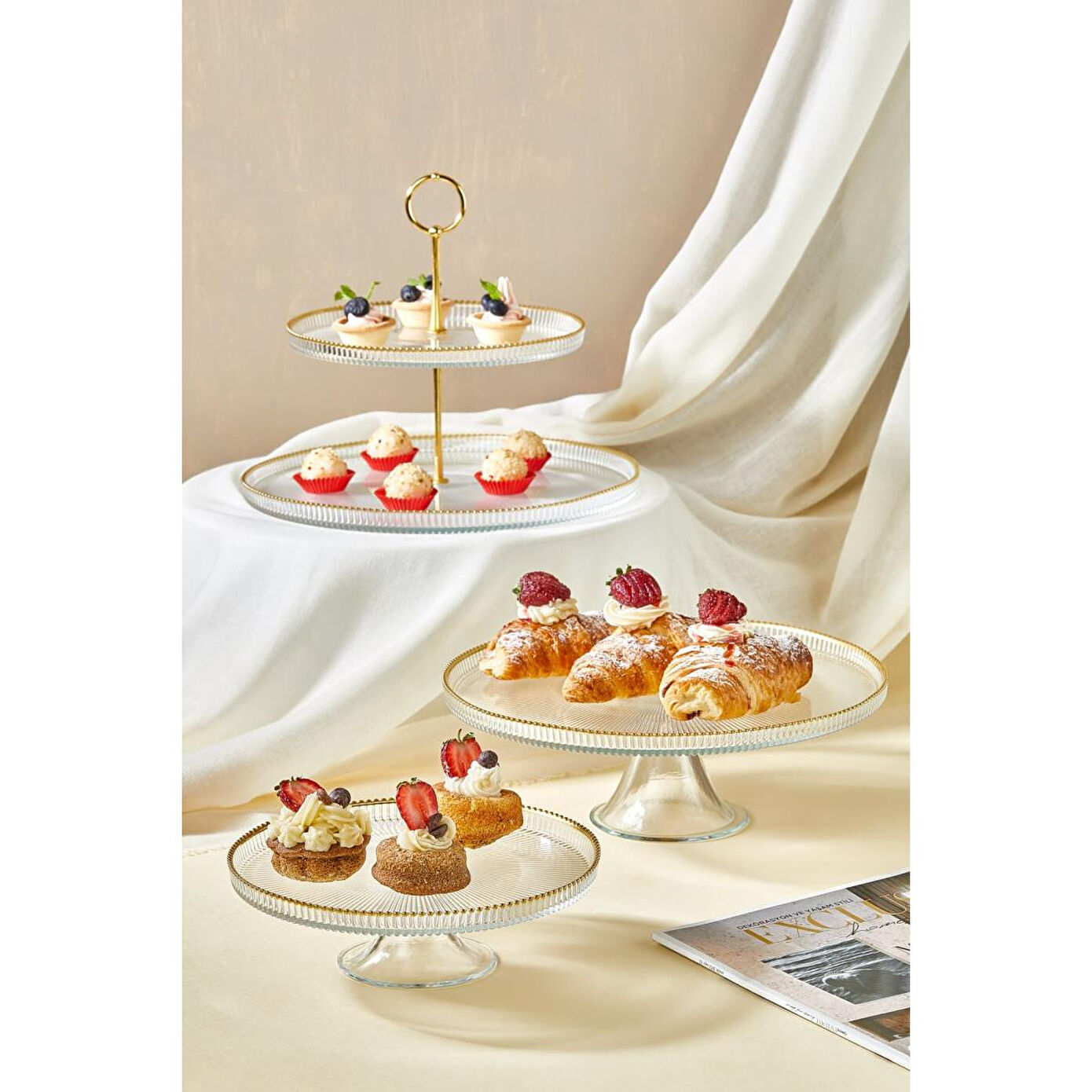 1 adet 28 cm ayaklı stand, 1 adet 21 cm ayaklı stand1 adet 21 cm ve 28 cm katlı stand (üst-alt ve birleştirme parçası dahil)Toplamda 5 parçadan oluşan şık sunum setiŞeffaf cam üzerine zarif altın rim desenlerKek, pasta ve tatlı sunumlarınızda estetik bir görünüm sağlarDayanıklı ve uzun ömürlü cam malzemeGünlük kullanımlar ve özel davetler için mükemmel bir tercihPaket İçeriği