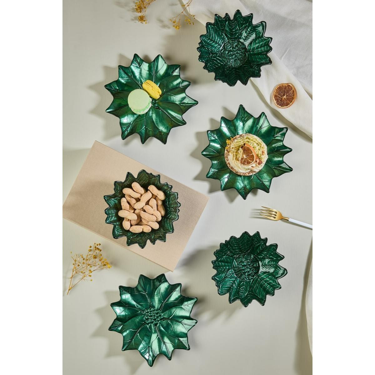 Lora Bianca Yeşil Poinsettia Cam Tabak & Kase Seti - 3 Adet Tabak - 3 Adet Kase Yeşil