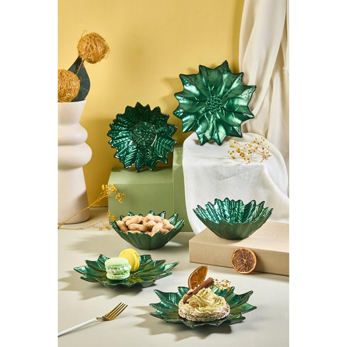 Doğanın zarif tonlarını sofralarınıza taşıyan Lora Bianca Yeşil Poinsettia Cam Tabak & Kase Seti, şıklığı ve doğallığı bir araya getiriyor. Yılbaşı çiçeği (Poinsettia) formundaki özgün tasarımıyla sofralarınıza tazelik ve canlılık katarken, parlak yeşil cam dokusu ile göz kamaştırıyor.
