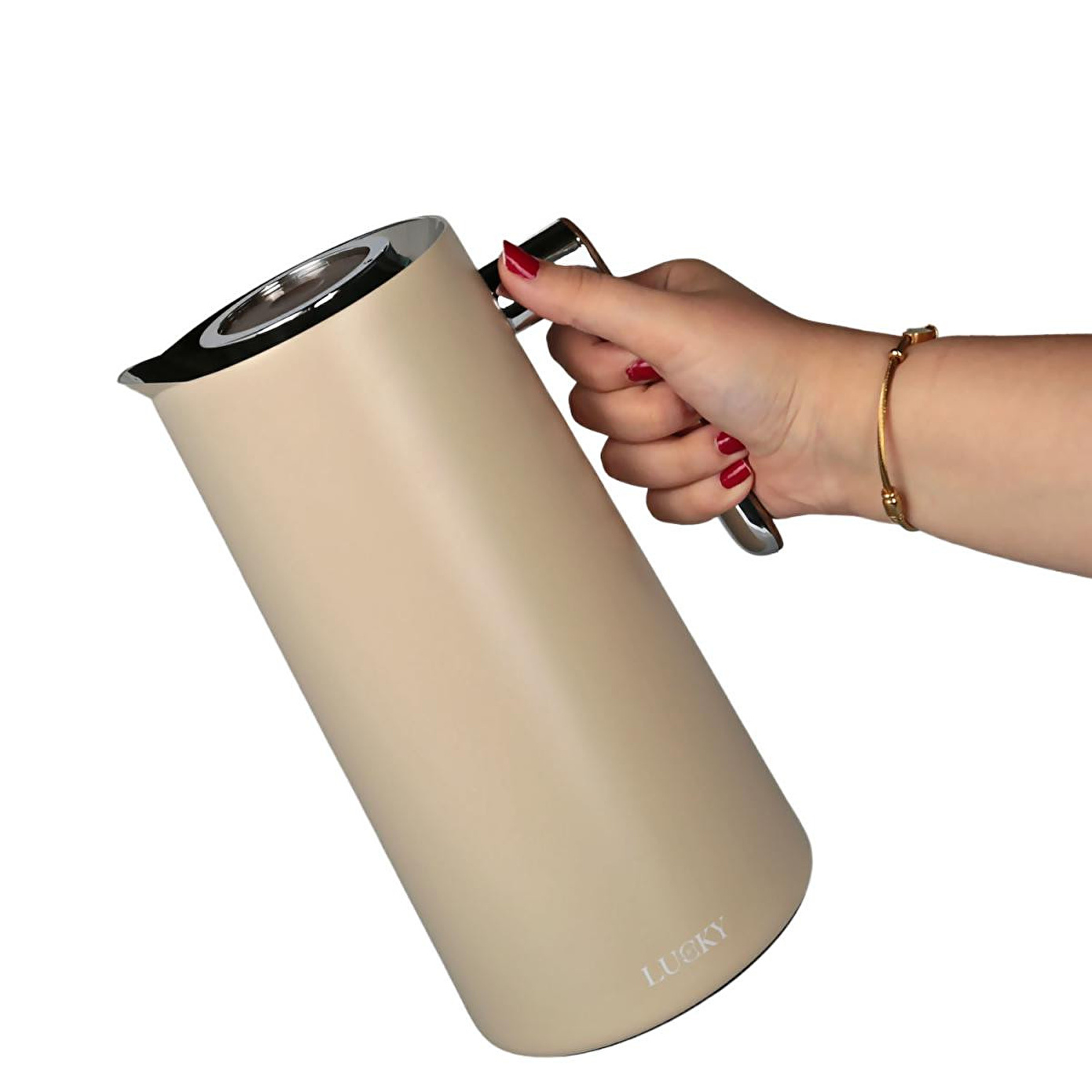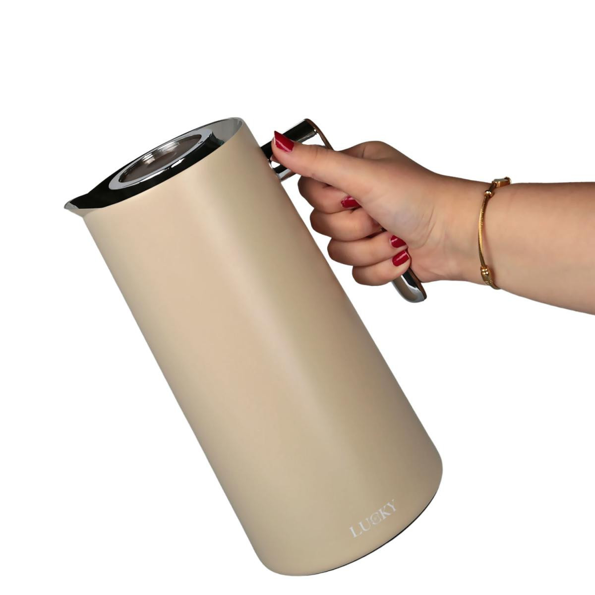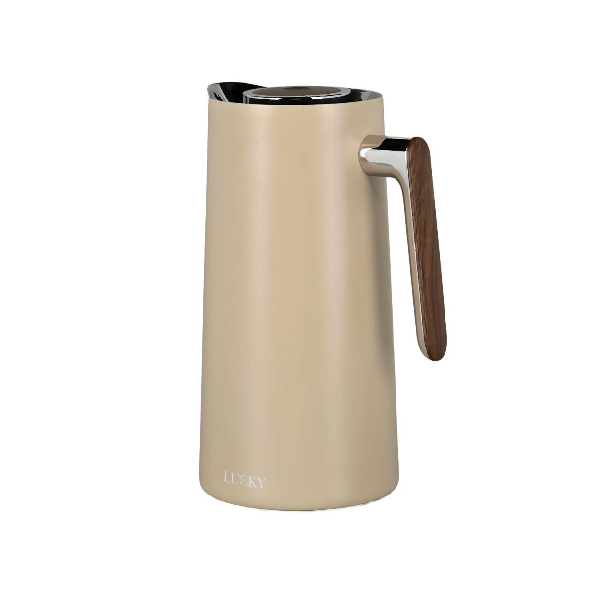 LuckyArt 1L Vakumlu Termos, sıcak içecekleri 12 saate, soğuk içecekleri 24 saate kadar ideal sıcaklıkta tutan verimli bir ısı yalıtım performansı sunar. 18/8 paslanmaz çelik dış gövde dayanıklılığı artırırken, hijyenik temperli cam iç hazne tat ve koku karışmasını önler. Basmalı kapak tek elle pratik kullanım sağlar; ahşap dokulu ergonomik kulp ise güvenli ve konforlu tutuş verir. Gıda ile temasa uygundur, BPA içermez; günlük kullanımda ofis, ev ve servis sunumları için şık bir çözümdür.