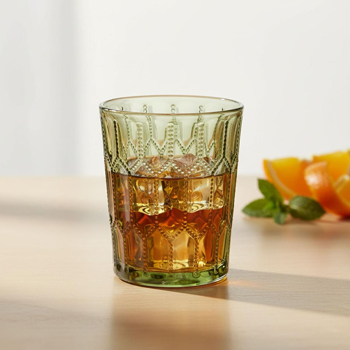 Kaliteli cam malzemeden üretilmiştir. Kalın ve dengeli yapısı, günlük kullanıma uygun sağlamlık sunar. Geometrik kesimler, ışığı kırarak bardağın içindeki yeşil rengin sofistike bir atmosfer yaratmasını sağlar.
