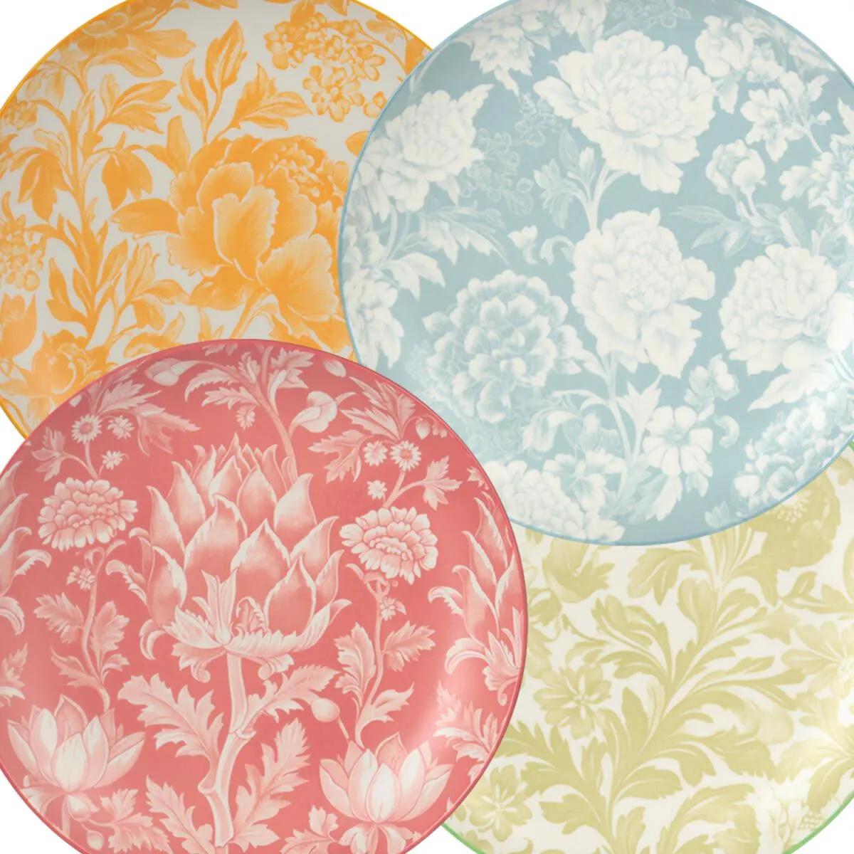 Tabaklar, turuncu/sarı, açık mavi, kırmızı/pembe ve açık yeşil olmak üzere dört farklı yumuşak pastel tonda, akışkan mermer (marbled) görünümlü çiçek motifleriyle süslenmiştir. Desenin akıcı ve sanatsal yapısı, her bir tabağı eşsiz kılar.