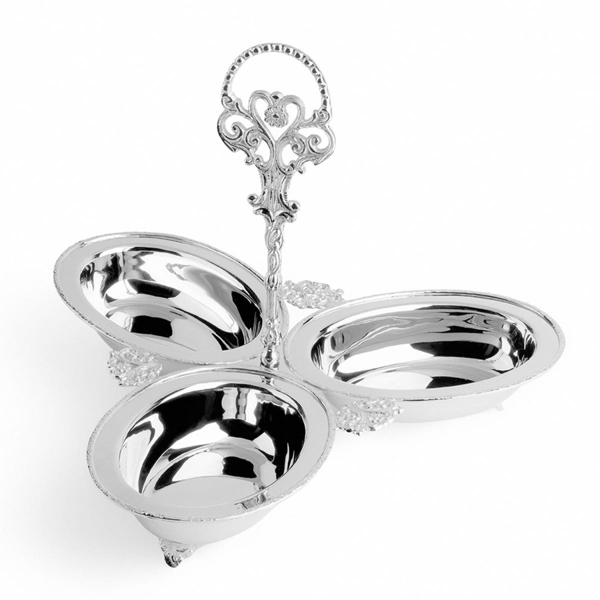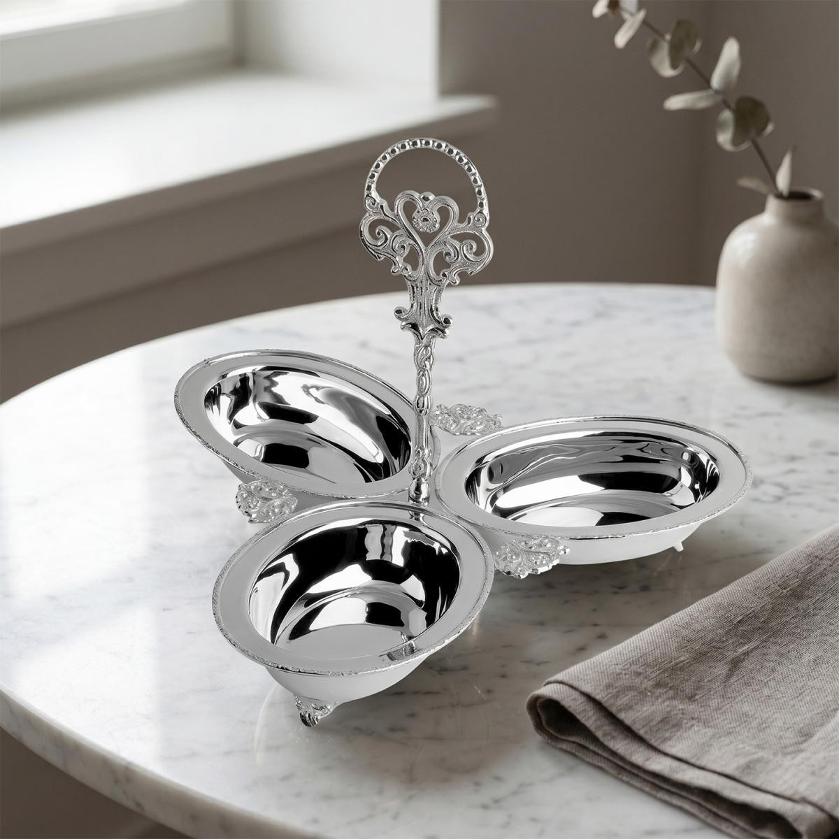 Paslanmaz çeliğin hijyenik ışıltısını, pirinç işçiliğinin antika zarafetiyle buluşturan bu üçlü sunumluk, sofralarınızda fonksiyonel bir sanat eseri duruşu sergiliyor. Üç ayrı haznesiyle farklı lezzetleri bir arada, birbirine karışmadan sunmanıza olanak tanıyan bu parça, kalabalık davetlerin en şık yardımcısıdır.