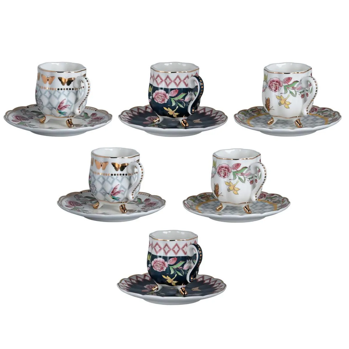 Set İçeriği: 6 adet ayaklı kahve fincanı, 6 adet fincan tabağı (toplam 12 parça)
