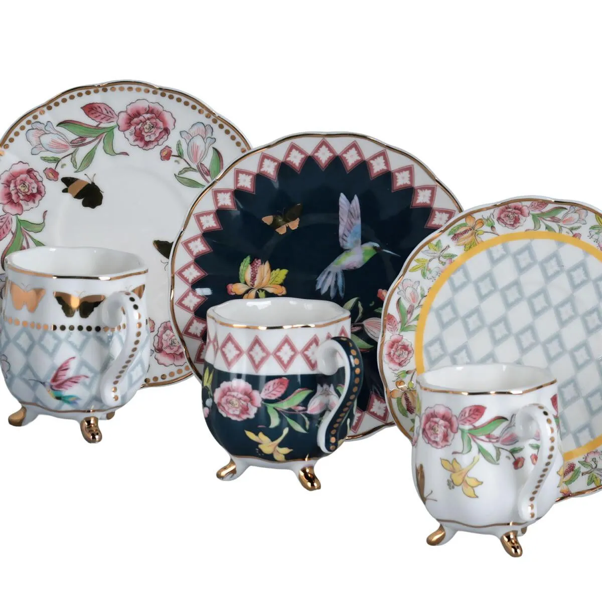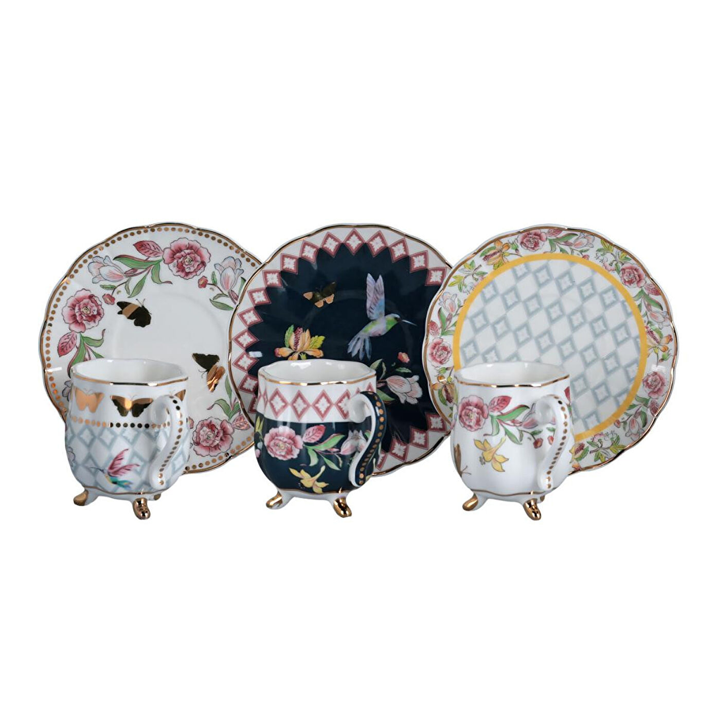 Bu set, hem desen çeşitliliği hem de ayaklı fincanların getirdiği görsel zenginlik sayesinde masanızda lüks bir hava yaratır. Misafirlerinizi ağırlarken veya özel günlerinizde ikramlarınızı üst düzeye taşımak için mükemmeldir. Yeni evlenecek çiftler veya özel gün hediyesi arayanlar için unutulmaz bir seçenektir.