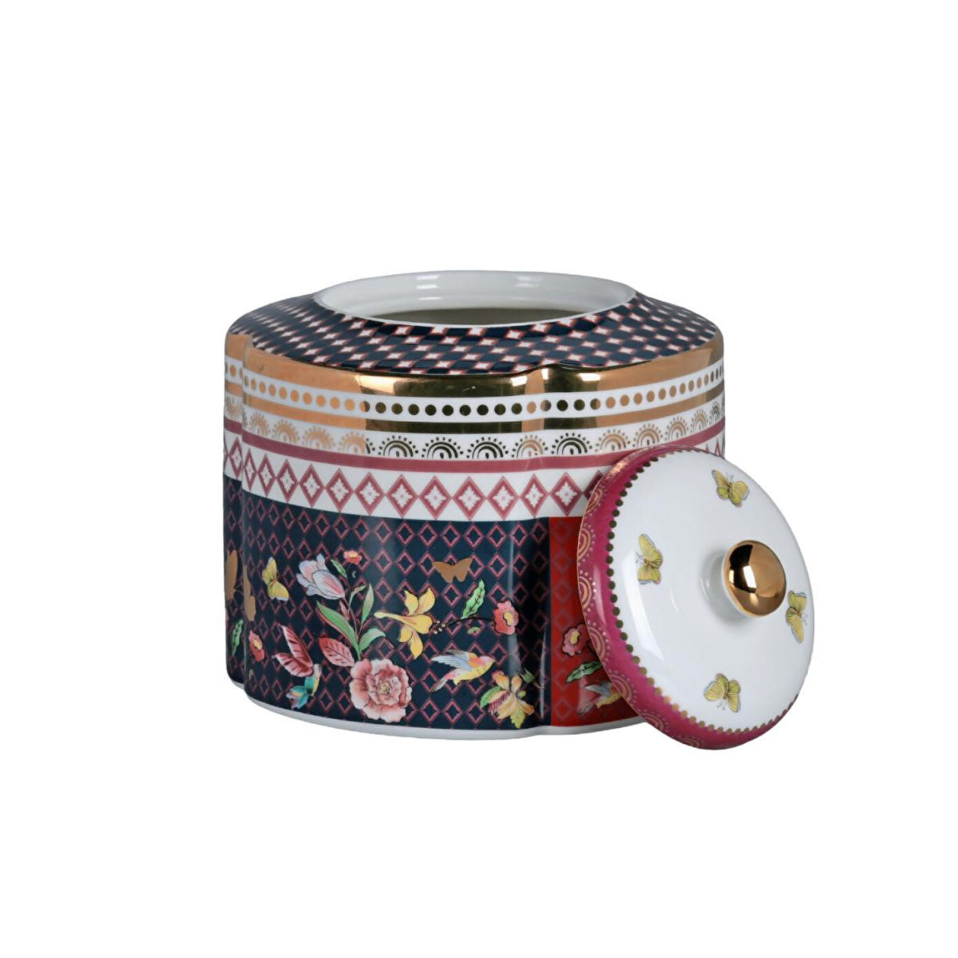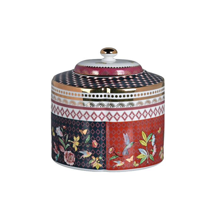 Kavanoz, siyah, derin kırmızı ve altın renklerinin hakim olduğu, patchwork (yama) tarzı karmaşık bir tasarıma sahiptir. Gövdede geometrik bantlar, damalı motifler ve narin kuş/çiçek figürleri bir aradadır. Kubbeli kapağında da benzer desenler ve tepe noktasında altın rengi bir topuz bulunmaktadır.