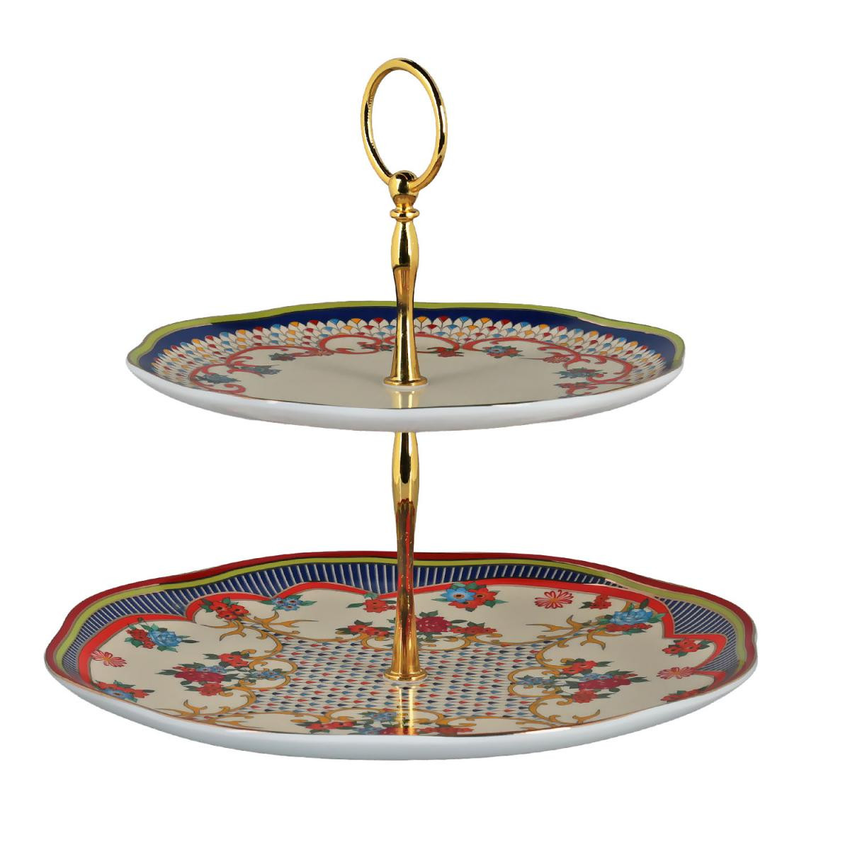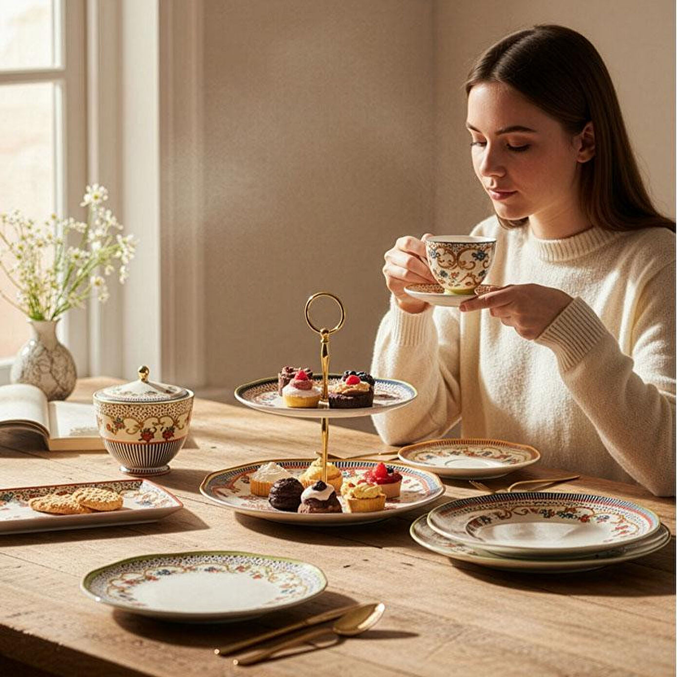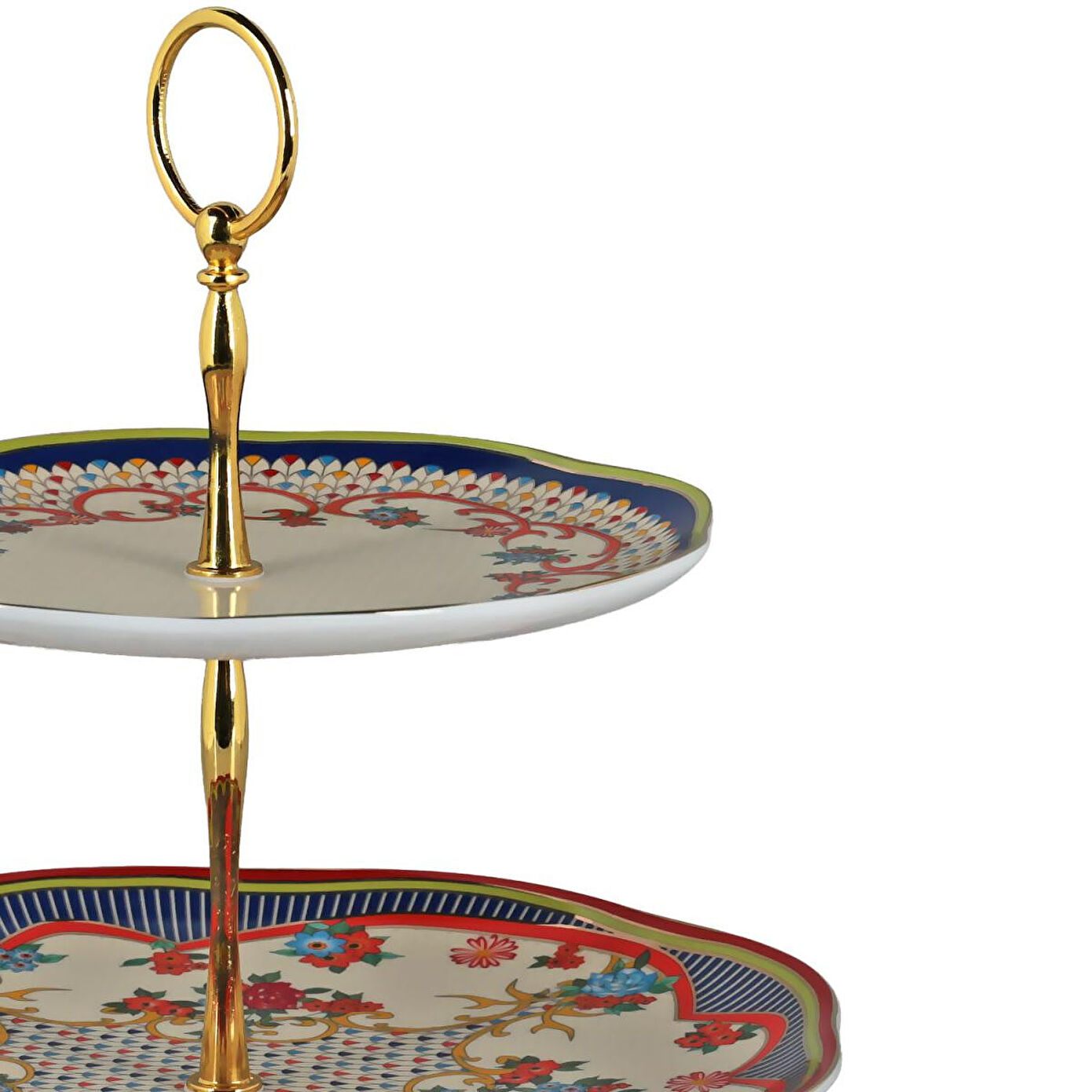 Fiora Serisi, çiçek bahçelerinin coşkusunu, Akdeniz’in sıcak renklerini ve geleneksel desenlerin zarafetini bir araya getiriyor. Her bir parça, el işçiliğini andıran ince detaylarla bezenmiş; kırmızı güller, mavi çiçekler ve altın kıvrımlar, sofranıza adeta bir sanat eseri gibi yerleşiyor. Canlı renklerin enerjisi, altın detayların zarafetiyle dengelenirken, farklı desenlerin uyumlu birleşimi sofranıza hem oyunbaz hem de sofistike bir hava katıyor. Günlük yemeklerde pozitif bir enerji, özel davetlerde ise hayranlık uyandıran bir şıklık sunuyor. Her ürün , kendi deseninde tasarlanmış şık kutusuyla geliyor; böylece hem kendinize hem de sevdiklerinize unutulmaz bir hediye oluyor. Fiora ile sofralarınız bir hikâye anlatıyor. Ürün İçerik : 1 Ad 27 cm alt tabak &1 Ad 19 cm Üst Tabak ve 1 Adet vidalı katlı kullanım için Metal bağlantı çubuğu Ölçü : Malzeme :New Bone Yüksek Kaliteli Porselen New Bone porselen, klasik porselene göre daha ince, hafif ve yüksek ışık geçirgenliğine sahip özel bir seramik türüdür. Parlak beyaz rengi, zarif görünümü ve dayanıklılığı ile sofralarınıza şık bir dokunuş katar. İnce yapısına rağmen sağlamdır ve uzun yıllar ilk günkü ışıltısını korur. Bakım ve Kullanımı : Elde Yıkama Tavsiye edilir.