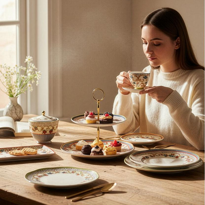 Fiora Serisi, çiçek bahçelerinin coşkusunu, Akdeniz’in sıcak renklerini ve geleneksel desenlerin zarafetini bir araya getiriyor. Her bir parça, el işçiliğini andıran ince detaylarla bezenmiş; kırmızı güller, mavi çiçekler ve altın kıvrımlar, sofranıza adeta bir sanat eseri gibi yerleşiyor. Canlı renklerin enerjisi, altın detayların zarafetiyle dengelenirken, farklı desenlerin uyumlu birleşimi sofranıza hem oyunbaz hem de sofistike bir hava katıyor. Günlük yemeklerde pozitif bir enerji, özel davetlerde ise hayranlık uyandıran bir şıklık sunuyor. Her set, kendi deseninde tasarlanmış şık kutusuyla geliyor; böylece hem kendinize hem de sevdiklerinize unutulmaz bir hediye oluyor. Fiora ile sofralarınız sadece yemek değil, bir hikâye anlatıyor. Ürün İçerik : 6 Ad Fincan &6 Ad Fincan Tabağı Ölçü : 220 cc Malzeme :New Bone Yüksek Kaliteli Porselen New Bone porselen, klasik porselene göre daha ince, hafif ve yüksek ışık geçirgenliğine sahip özel bir seramik türüdür. Parlak beyaz rengi, zarif görünümü ve dayanıklılığı ile sofralarınıza şık bir dokunuş katar. İnce yapısına rağmen sağlamdır ve uzun yıllar ilk günkü ışıltısını korur. Bakım ve Kullanımı : Elde Yıkama Tavsiye edilir.