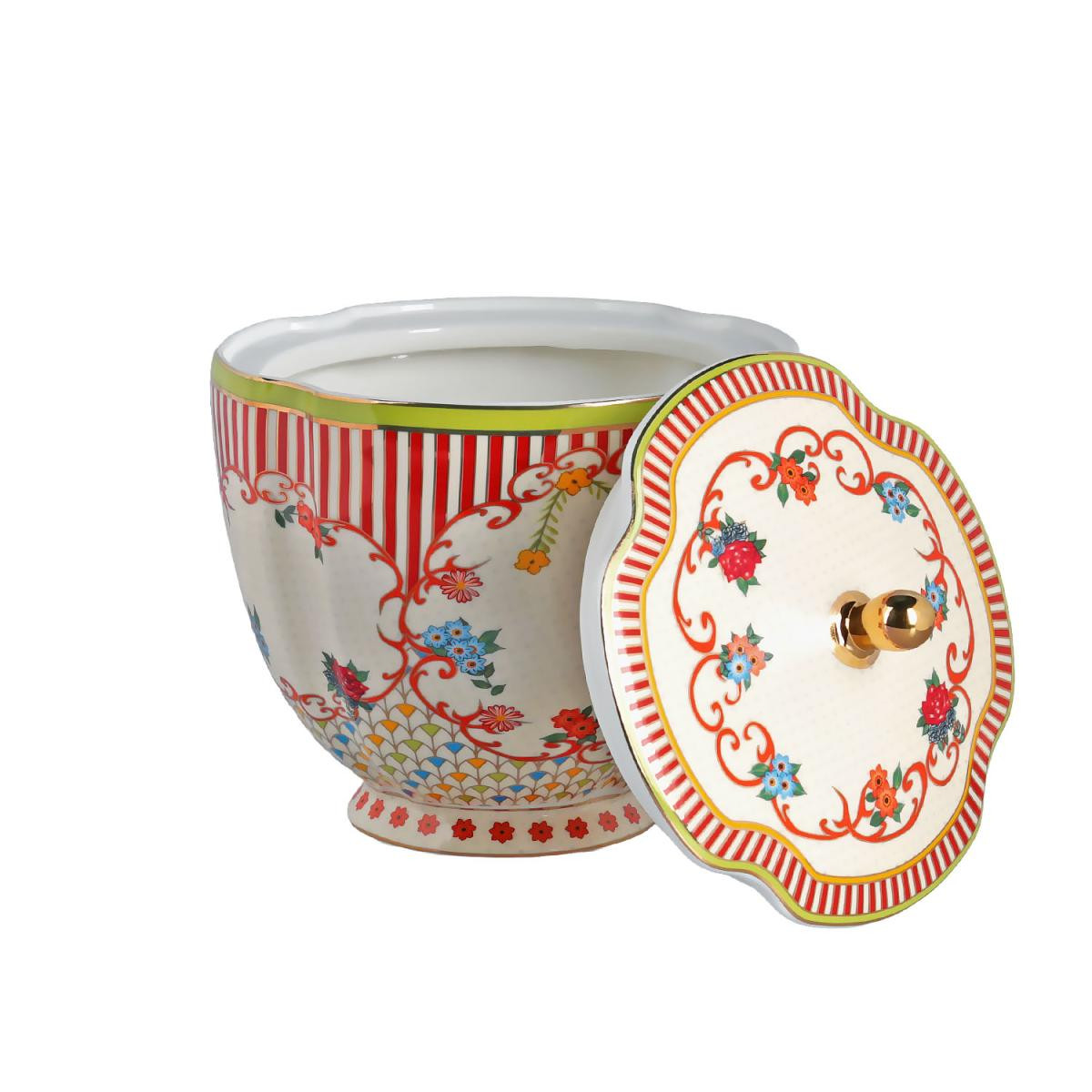 Fiora Serisi, çiçek bahçelerinin coşkusunu, Akdeniz’in sıcak renklerini ve geleneksel desenlerin zarafetini bir araya getiriyor. Her bir parça, el işçiliğini andıran ince detaylarla bezenmiş; kırmızı güller, mavi çiçekler ve altın kıvrımlar, sofranıza adeta bir sanat eseri gibi yerleşiyor. Canlı renklerin enerjisi, altın detayların zarafetiyle dengelenirken, farklı desenlerin uyumlu birleşimi sofranıza hem oyunbaz hem de sofistike bir hava katıyor. Günlük yemeklerde pozitif bir enerji, özel davetlerde ise hayranlık uyandıran bir şıklık sunuyor. Her set, kendi deseninde tasarlanmış şık kutusuyla geliyor; böylece hem kendinize hem de sevdiklerinize unutulmaz bir hediye oluyor. Fiora ile sofralarınız bir hikâye anlatıyor. Ürün İçerik : 1 Ad Kavanoz Ölçü : 14 cm Malzeme :New Bone Yüksek Kaliteli Porselen New Bone porselen, klasik porselene göre daha ince, hafif ve yüksek ışık geçirgenliğine sahip özel bir seramik türüdür. Parlak beyaz rengi, zarif görünümü ve dayanıklılığı ile sofralarınıza şık bir dokunuş katar. İnce yapısına rağmen sağlamdır ve uzun yıllar ilk günkü ışıltısını korur. Bakım ve Kullanımı : Elde Yıkama Tavsiye edilir.