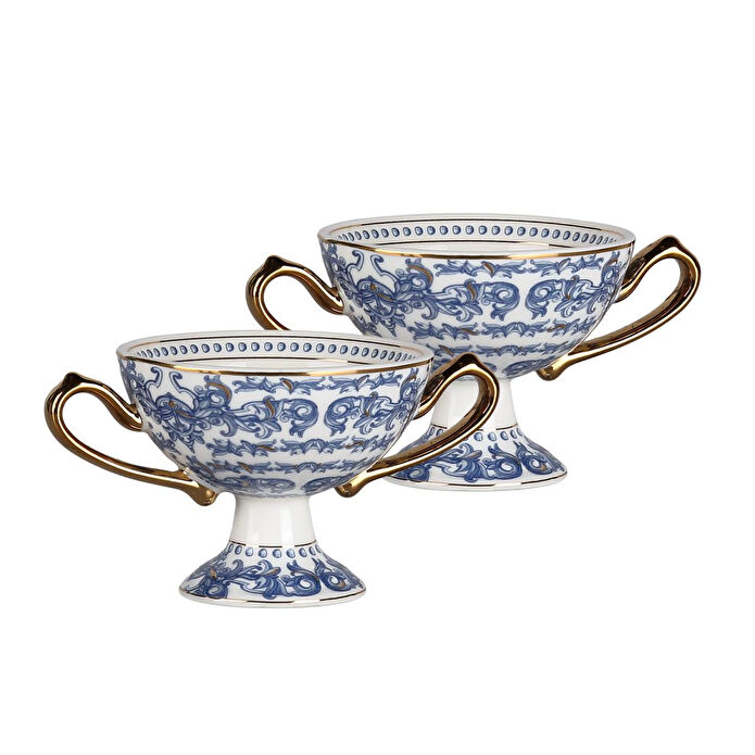 Florance Serisi, beyaz zemin üzerine işlenmiş zarif mavi floral motifleri ve parlak altın kulp detaylarıyla klasik Avrupa porselen sanatının şıklığını sofralarınıza taşıyor. Yüksek ayaklı formu ve çift kulplu tasarımı, hem estetik hem de kolay kullanım imkânı sunar. 2’li kase seti; tatlı veya özel sunumlar için idealdir. Mavi-beyaz uyumunu altın yaldızlı dokunuşlarla tamamlayan bu tasarım, sofralarınıza hem nostaljik hem de lüks bir hava katar. Ayrıca kendi desenini taşıyan şık kutusuyla hediye alternatifi olarak mükemmel bir tercihtir. Ürün İçerik : 2 Adet Kase Ebat : Malzeme :New Bone Yüksek Kaliteli Porselen New Bone porselen, klasik porselene göre daha ince, hafif ve yüksek ışık geçirgenliğine sahip özel bir seramik türüdür. Parlak beyaz rengi, zarif görünümü ve dayanıklılığı ile sofralarınıza şık bir dokunuş katar. İnce yapısına rağmen sağlamdır ve uzun yıllar ilk günkü ışıltısını korur. Bakım ve Kullanımı : Elde Yıkama Tavsiye edilir