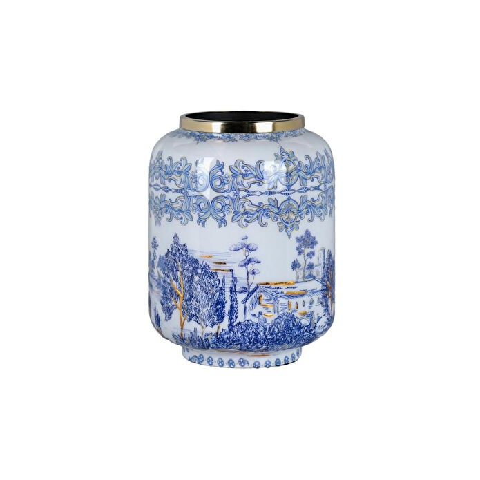 Vazo, klasik mavi-beyaz porselen tarzında, detaylı peyzaj motifleri ve üst kısımdaki altın rengi detaylarla zenginleştirilmiş geometrik bantlarla süslenmiştir. Zengin desen, vazonun etrafını sararak bütünlüklü ve sofistike bir görünüm sağlar.