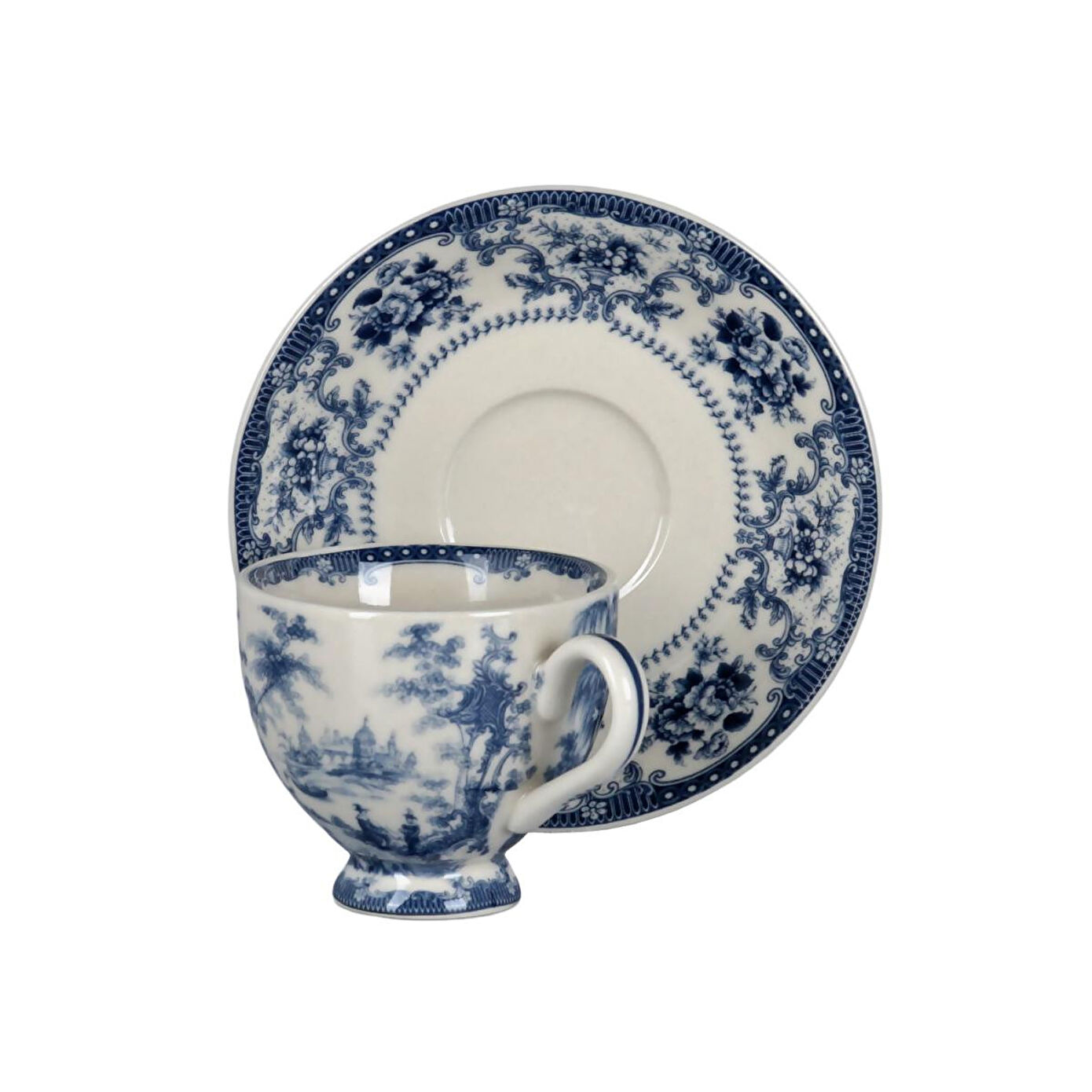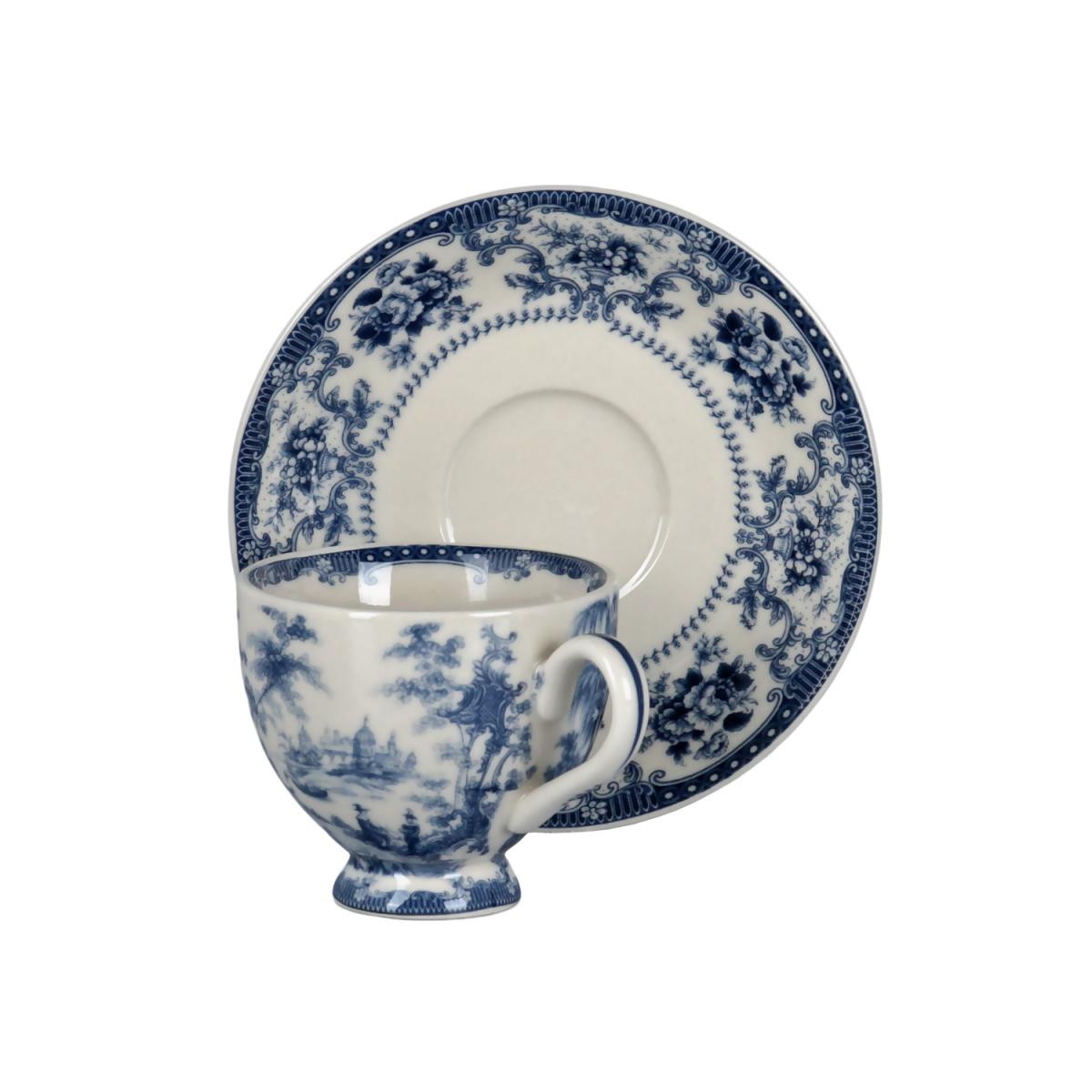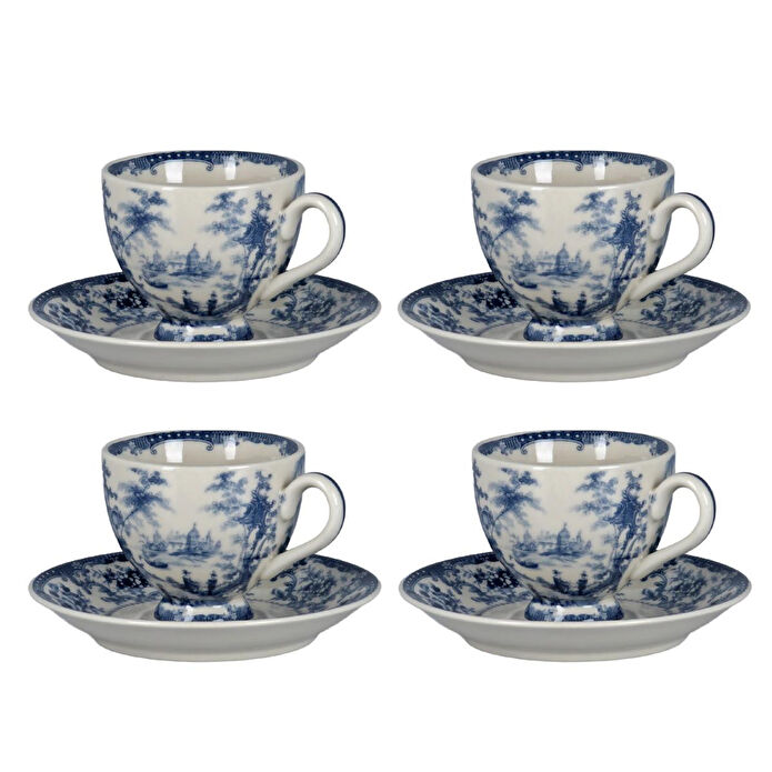 Fincanlar ve tabaklar, geleneksel porselen sanatını yansıtan, yoğun mavi renkte manzara veya pastoral motiflerle süslenmiştir. Beyaz zemin üzerindeki bu desenler, fincan ağzında ve kulplarda bulunan mavi bordürlerle tamamlanmıştır.