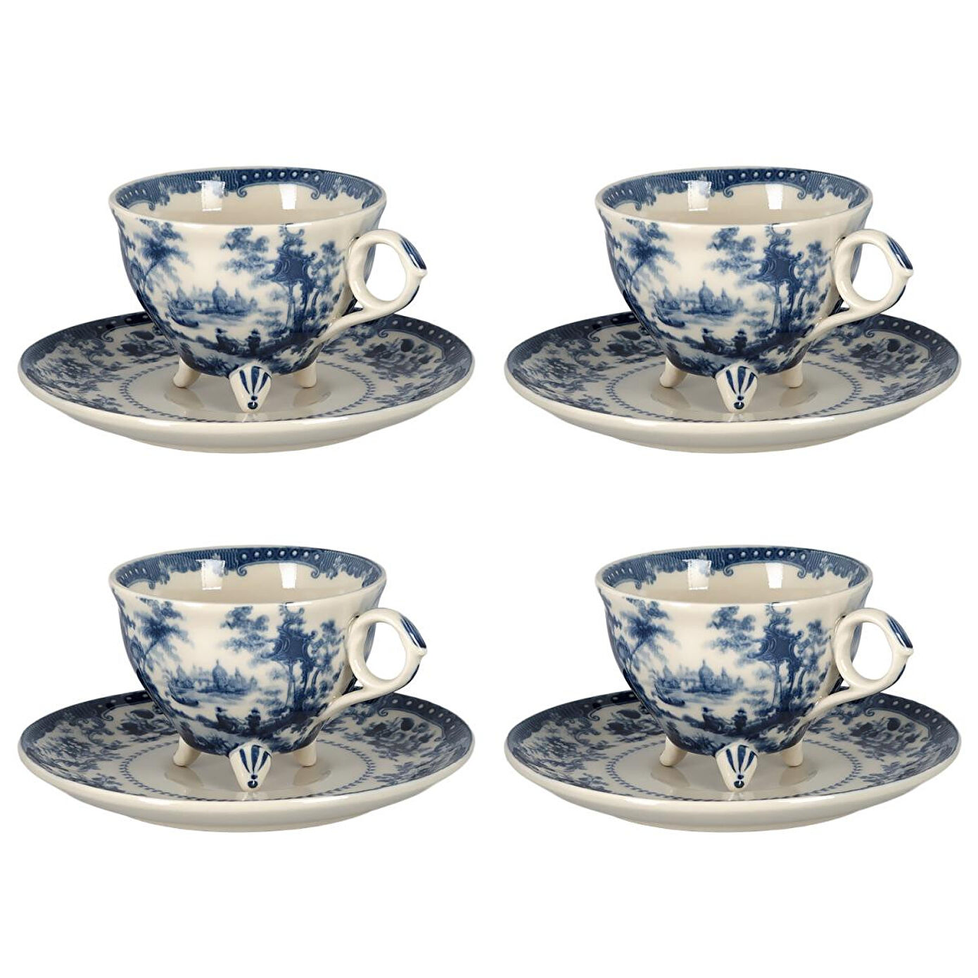 Fincanlar ve tabaklar, geleneksel porselen sanatını yansıtan, yoğun mavi renkte manzara veya pastoral motiflerle süslenmiştir. Beyaz zemin üzerinde yer alan bu desenler, fincan ağzında ve kulplarda bulunan mavi bordürlerle tamamlanmıştır.