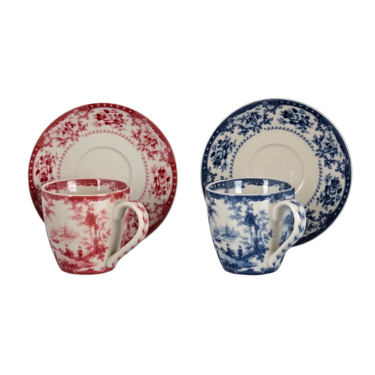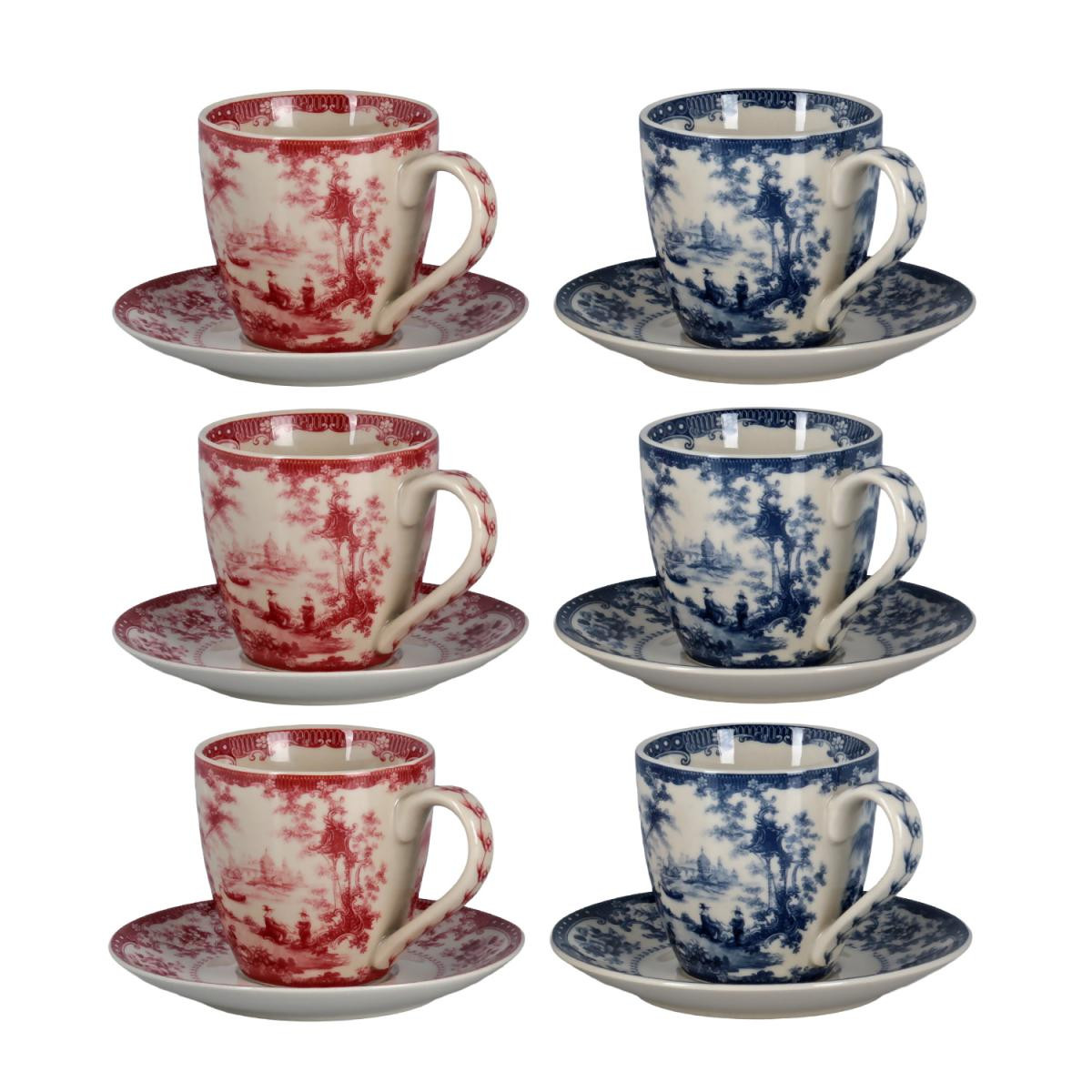 Set İçeriği: 6 adet kahve fincanı, 6 adet fincan tabağı (3 Kırmızı, 3 Mavi desenli)