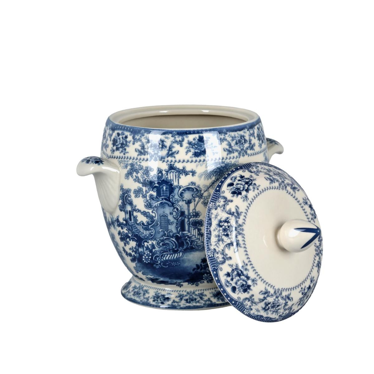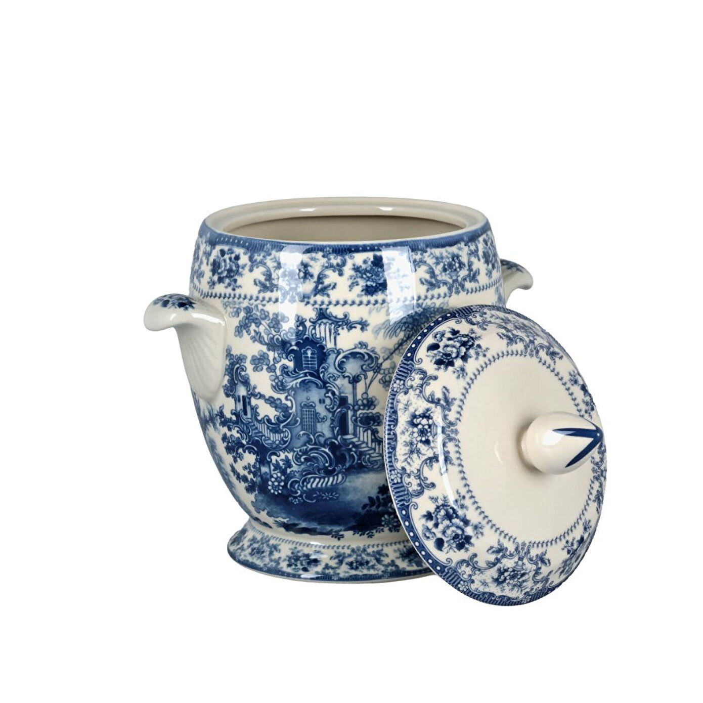 Kavanozun tüm yüzeyi, Florantine koleksiyonuna özgü, yoğun mavi-beyaz tonlarda manzara veya pastoral sahne motifleriyle süslenmiştir. Gövdesindeki ornat kulplar ve kapağın üzerindeki dekoratif topuz, tasarıma lüks ve klasik bir ihtişam katar.