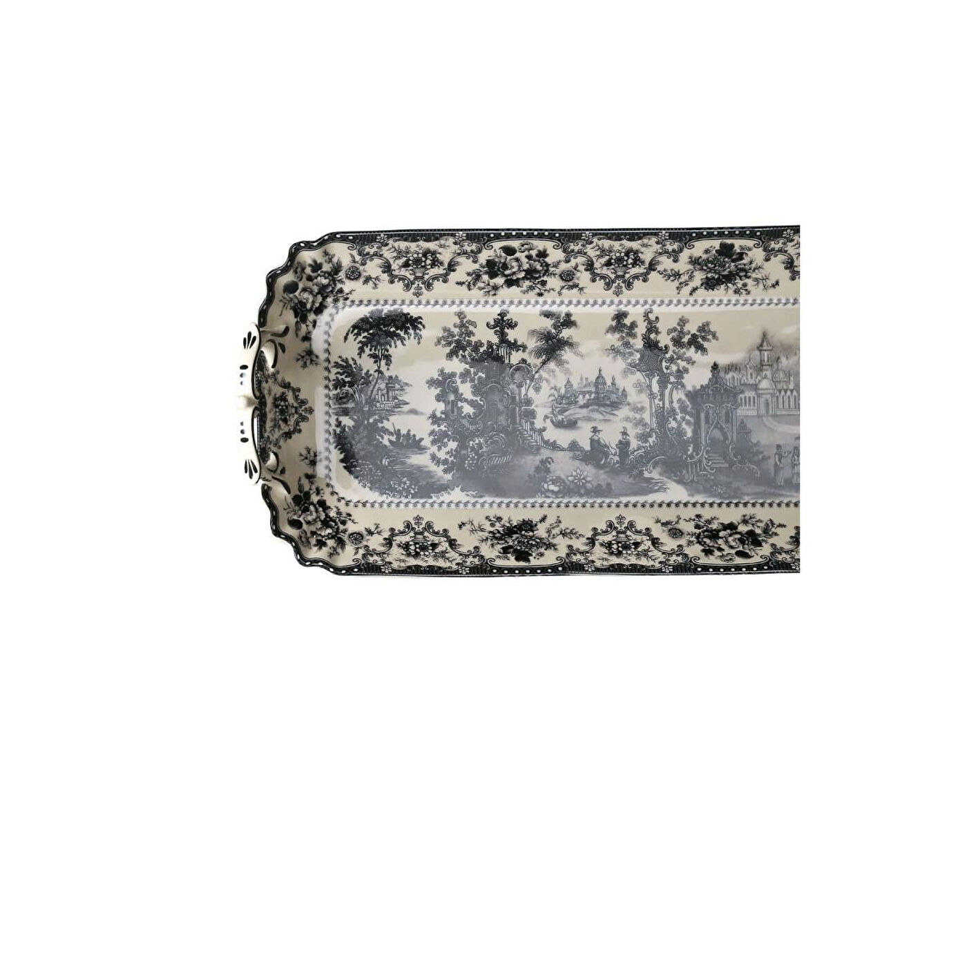 Lucky Art Florantine Stoneware 42cm Kulplu Baton Tabak zamansız şıklığı ve sanatsal detaylarıyla Florantine, klasik estetiği sevenler için eşsiz bir koleksiyon.; Siyah-beyaz tonlarının zarif kontrastı, ince detaylarla süslenmiş pastoral sahnelerle birleşerek geçmişin ihtişamını günümüze taşıyor.; El işçiliğini andıran desenleri, sofistike bir zerafet sunarken, romantik dokusuyla her sofrayı adeta bir sanat eserine dönüştürüyor.; Dayanıklı malzemeden üretilen tabağınız, 42 cm çapı ile yemeklerinizi şık bir şekilde sunmanıza olanak tanır.; Hem günlük kullanımda hem de özel davetlerde rahatlıkla tercih edilebilecek bu servis tabağı, uzun ömürlü yapısı ve kolay temizlenebilir yüzeyi ile pratiklik de sağlar.; Ebat: 42cm Malzeme: Fine Stoneware Bakım ve kullanım: Elde yıkanması tavsiye edilir