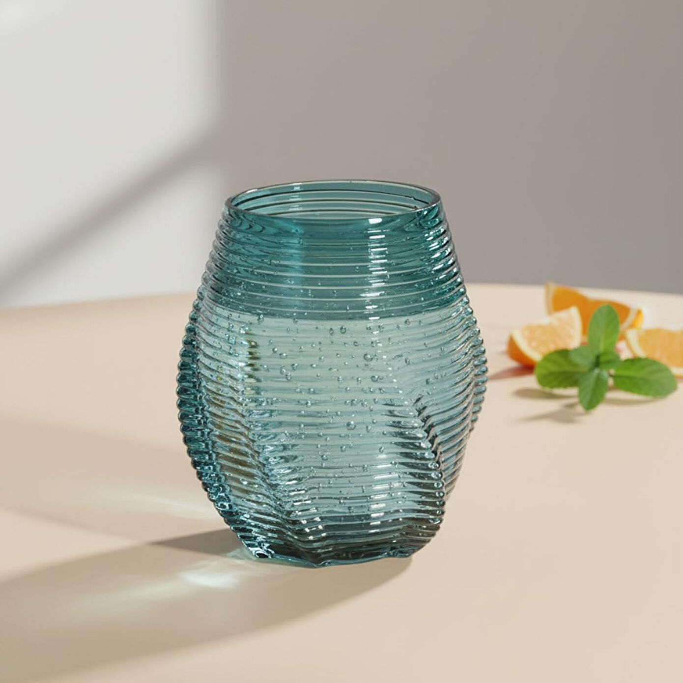 Kaliteli cam malzemeden üretilmiştir. Kalın ve dengeli yapısı, günlük kullanıma uygun sağlamlık sunar. Mavi rengi, ışığı yumuşatarak mekana sofistike ve modern bir atmosfer katar.