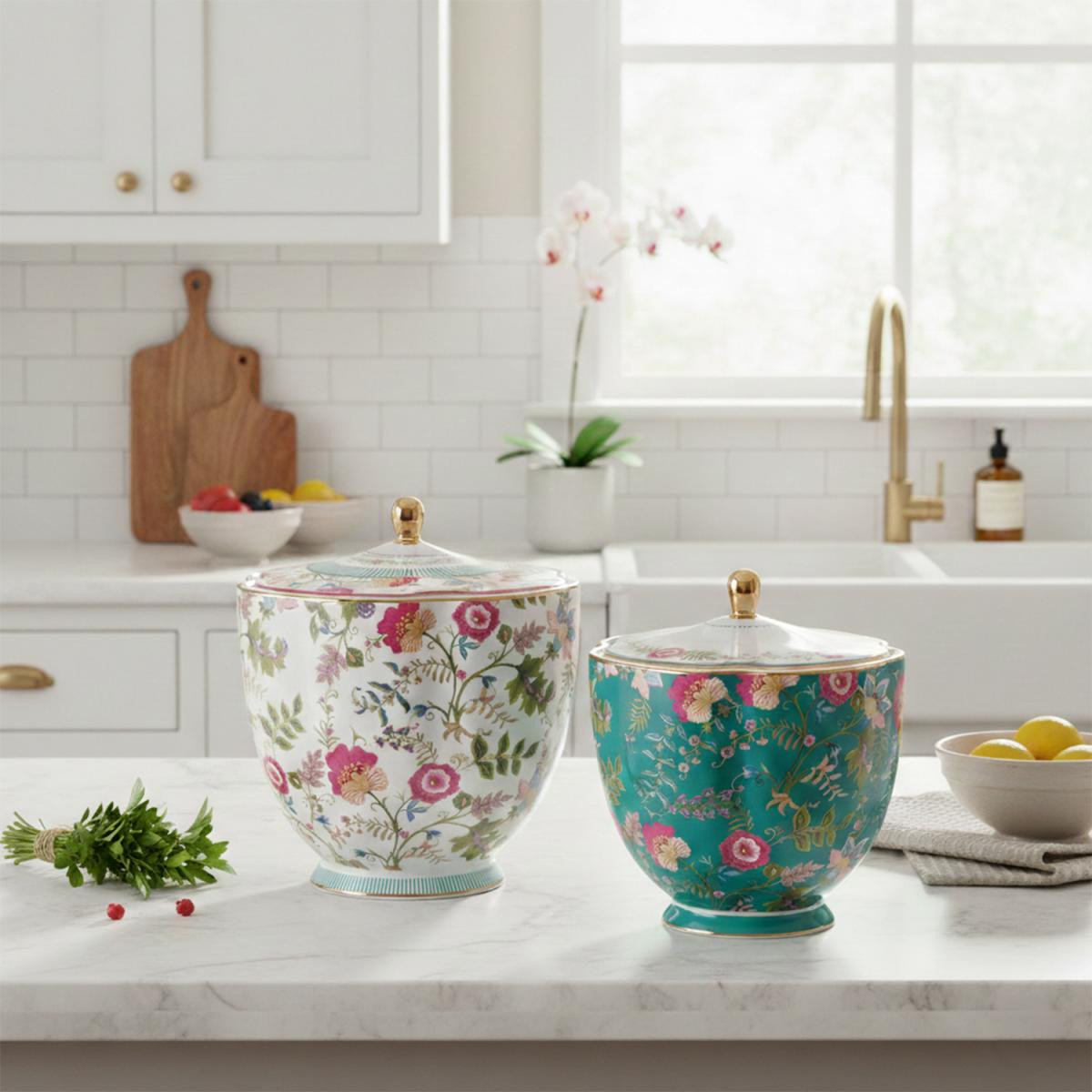 Estetik Tasarım: Pastel tonlardaki çiçek motifleri ve altın rengi tutacak detayına sahip kapağı ile hem modern hem de klasik mutfaklara uyum sağlar.