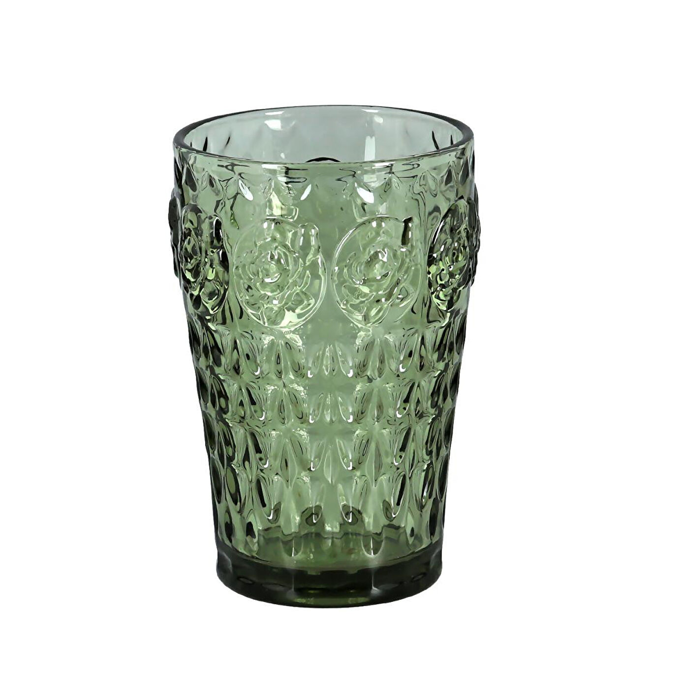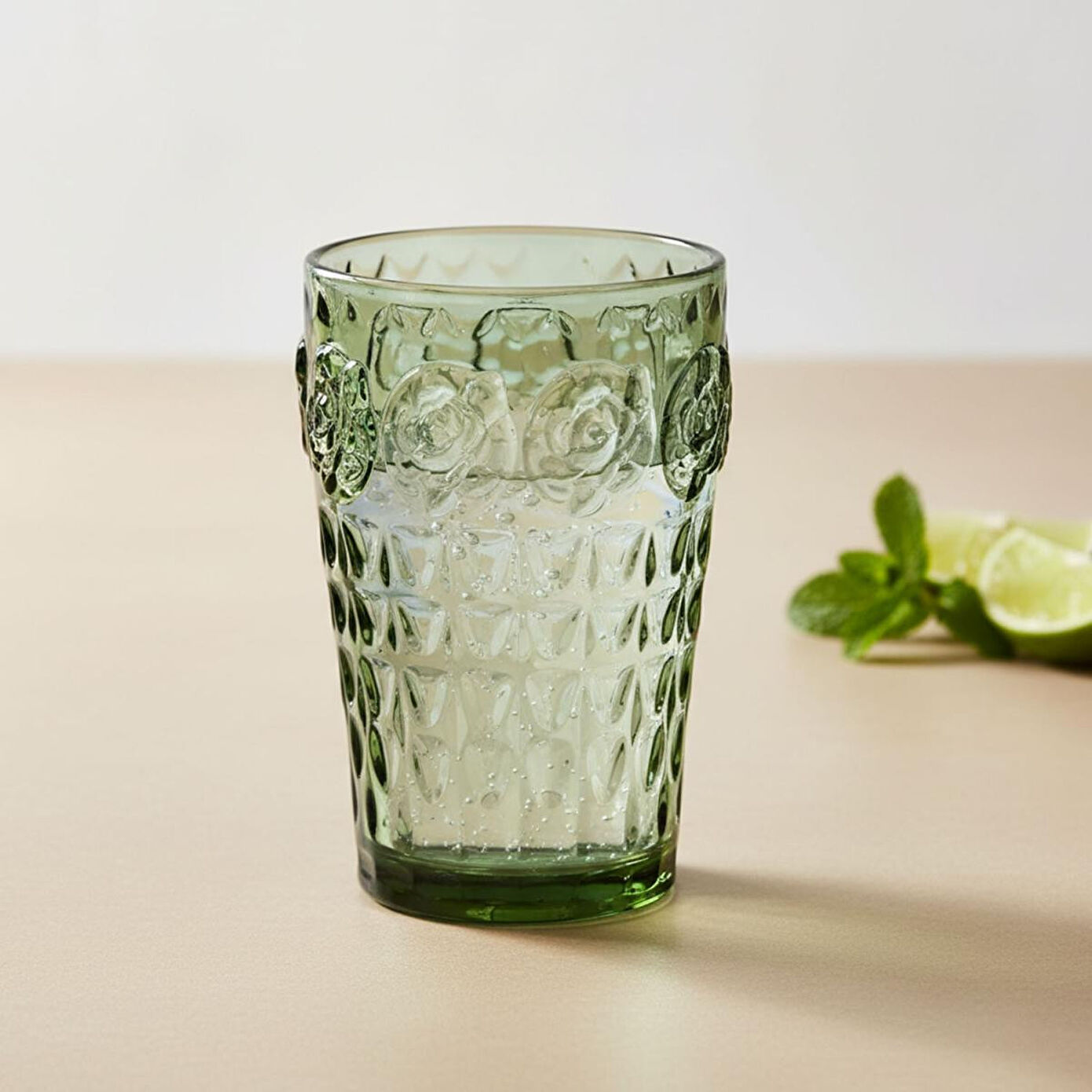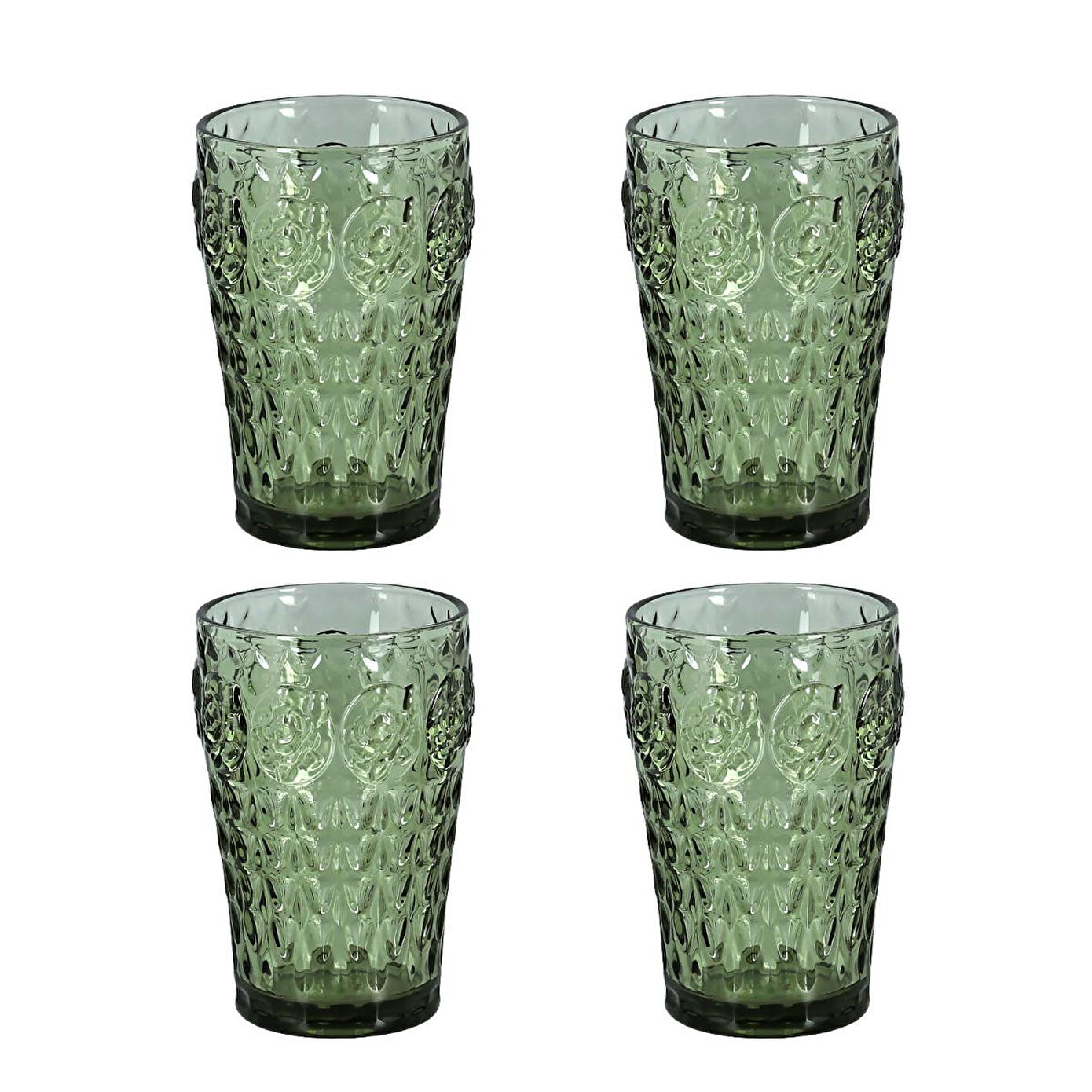 Bardaklar, derin ve tazeleyici yeşil rengindedir. Silindirik formdaki gövdesi, ışığı güzelce yansıtan geometrik ve kabartmalı bir yüzeye sahiptir.