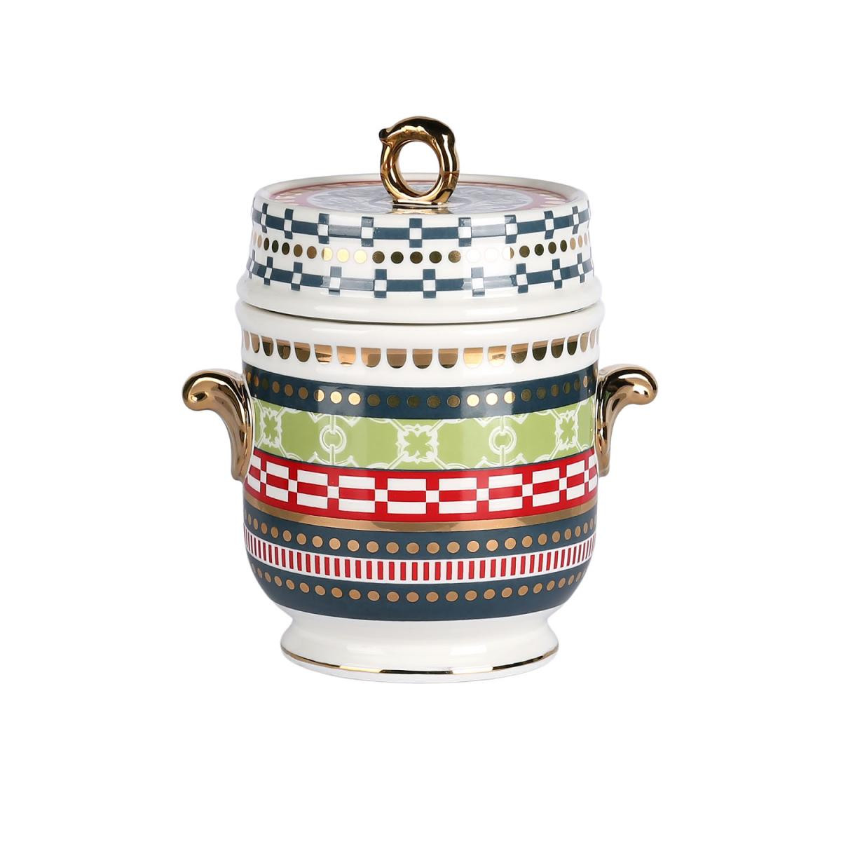 Lucky Art Lancelot New Bone China Porselen Kulplu 16 cm Kavanoz zarif ve asil desenleriyle sofranıza kraliyet dokunuşu getiriyor. Klasik barok motifler, altın detaylarla harmanlanarak ihtişamlı bir görünüm sunuyor. New bone porselenin inceliğiyle buluşan bu tasarım, geleneksel şıklığı modern sofralara taşıyor. Yüksek kaliteli bone china porselenden üretilmiş bu şık kulplu kavanoz kompakt ve zarif yapısı, çay, kahve, şeker veya diğer küçük kuru malzemeleri düzenli ve şık bir şekilde saklamanıza olanak tanır. Elde yıkanması tavsiye edilen bu kavanoz, uzun ömürlü kullanım ve yüksek kaliteli görünüm sağlar. Kullanım sonrası, hafif deterjanlı suyla nazikçe yıkanması ve nemli bir bezle silinmesi, desenlerin ve porselenin kalitesini korur ve kavanozun estetik görünümünü uzun süre muhafaza eder. Ebat: 16cm Malzeme: New Bone China Porselen Bakım ve kullanım: Elde yıkanması tavsiye edilir