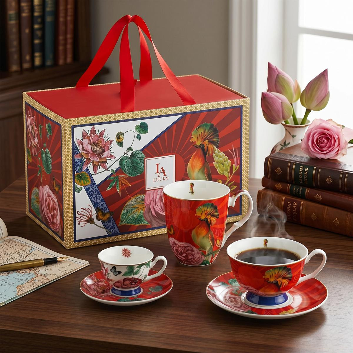 Sabahın ilk kahvesinden akşamüzeri çayına kadar günün tüm içecek seremonilerini sanatsal bir yolculuğa dönüştürün! Liorine serisinin imzası olan egzotik kuş motiflerini, canlı tropikal çiçekleri ve zengin renk paletini bir araya getiren bu kişisel set, her içim alışkanlığına özel bir seçenek sunuyor.