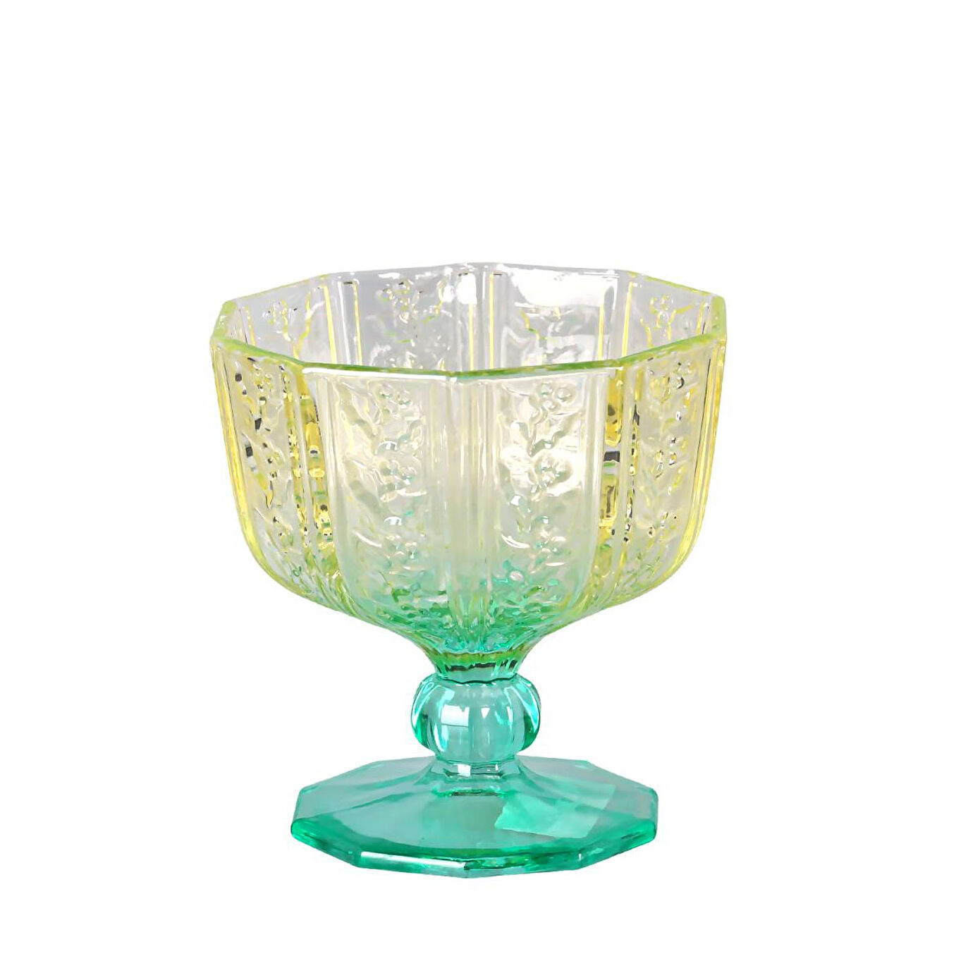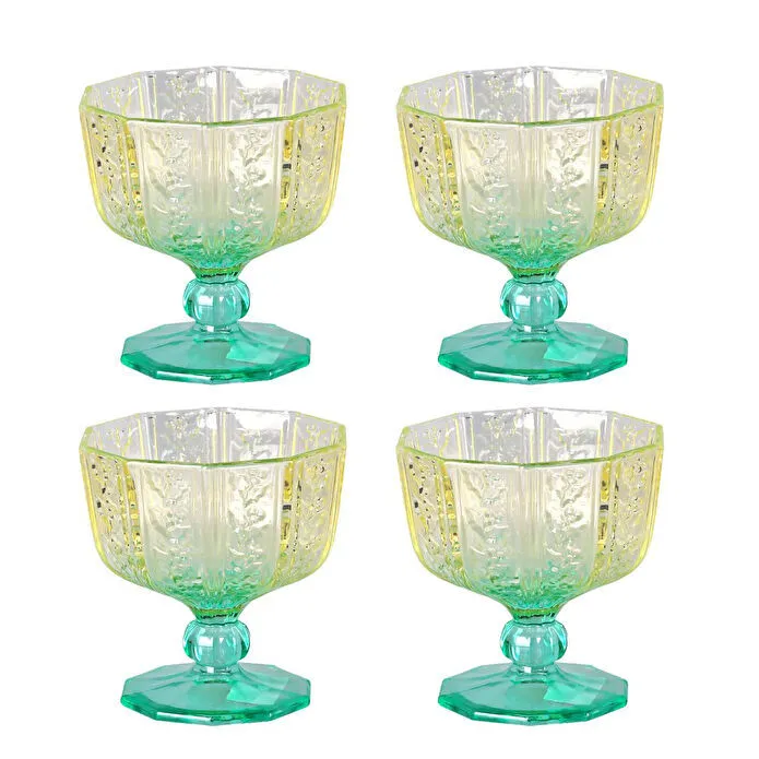 MİRA 4’lü Cam Ayaklı Kase Seti, 370 cc hacmi ve turkuaz ile kehribar renklerinin canlı kontrastıyla tatlı sunumlarınızı estetik bir şölene dönüştürüyor. Zarif ayaklı yapısı, dondurma ve şık kuplar için ideal bir zemin hazırlar.
