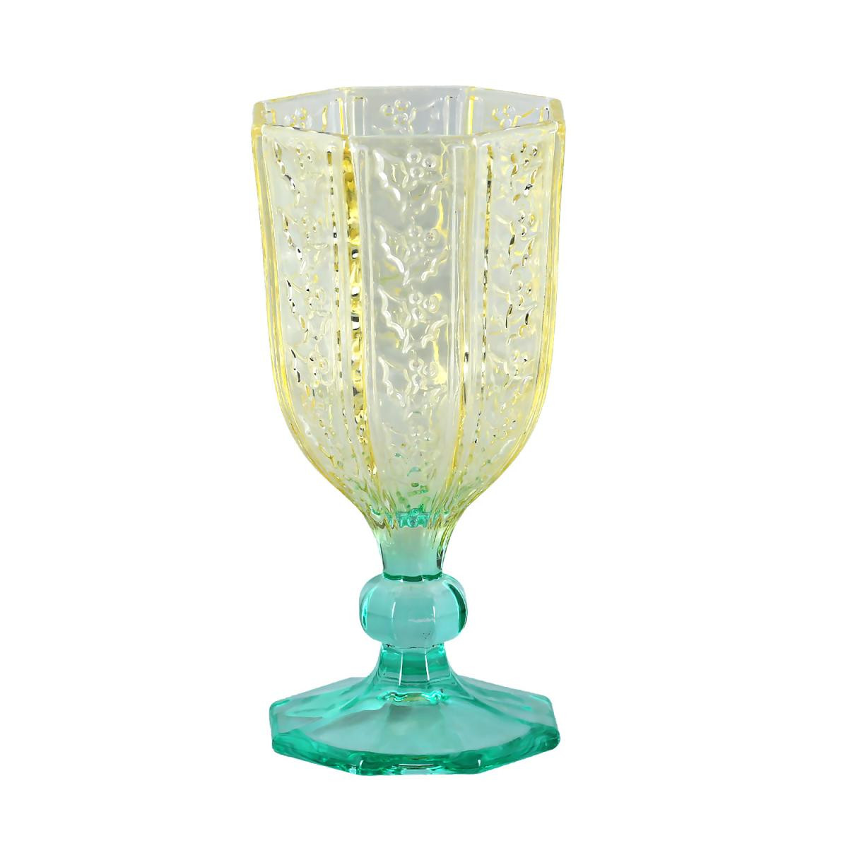 Kadehler, canlı turkuaz renkteki ayak ve taban ile, açık, desenli ve hafif sarımsı bir tona sahip kadeh kısmının kontrastından oluşur. Kadeh kısmı kabartmalı ve dokulu bir yüzeye sahiptir.