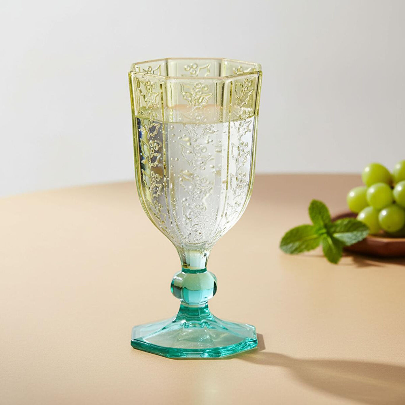 Kaliteli cam malzemeden üretilmiştir. Ağır ve dengeli ayaklı yapısı, kadehin stabil durmasını sağlar. Turkuaz rengi, masada güçlü bir renk vurgusu yaparken, dokulu yüzey ışığı güzelce yansıtır.