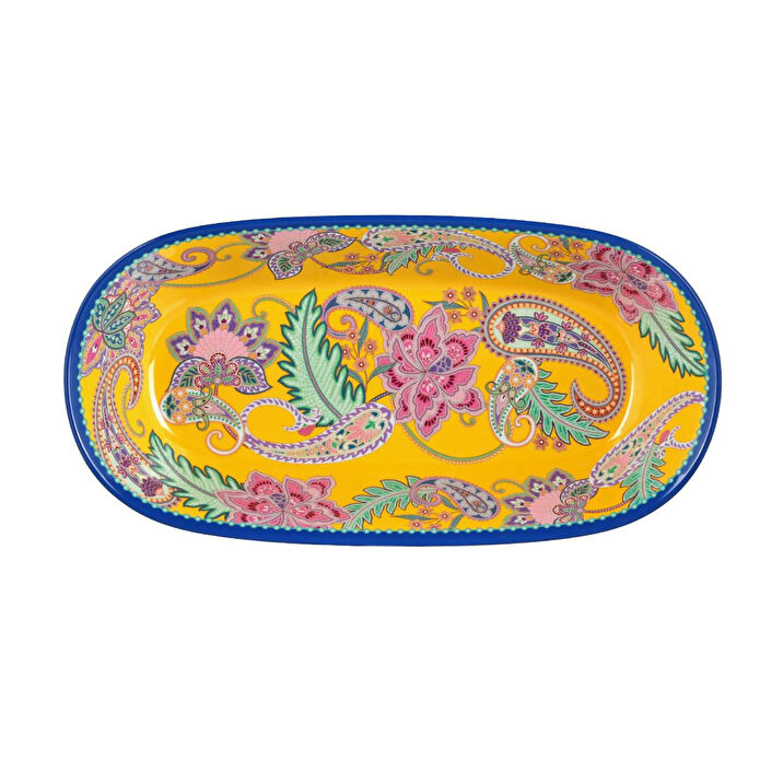 PAISELLE 2'li Baton Sunum Tabağı Seti, uzun ve zarif formuyla özel sunumlarınız için tasarlanmıştır. Set, canlı paisley desenini modern bir baton (uzun oval/dikdörtgen) formda bir araya getirerek sofranıza egzotik ve sofistike bir hava katmak üzere tasarlanmıştır. Parlak sarı zemin üzerinde pembe, mavi ve yeşil tonları, desenin dinamizmini vurgular.