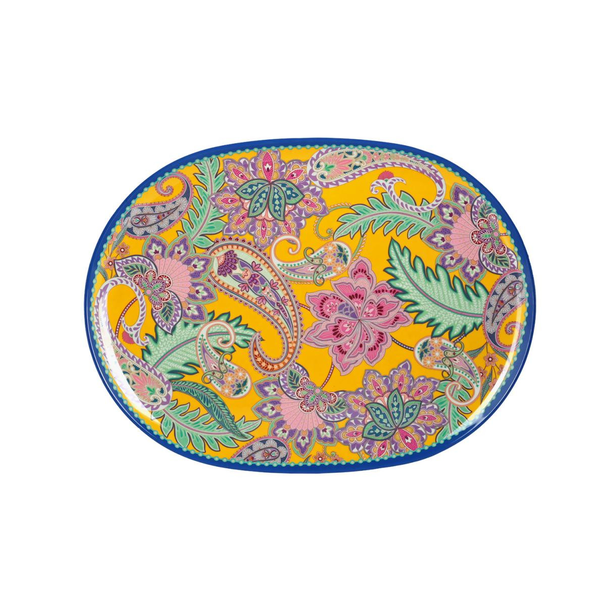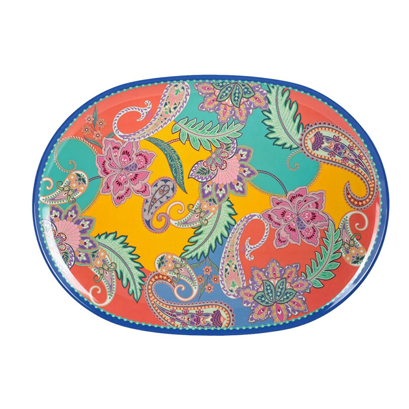 PAISELLE 2'li Tepsi Seti, servislerinizi kolaylaştırmak ve sofranıza egzotik bir canlılık katmak üzere tasarlanmıştır. Set, büyük ve küçük olmak üzere iki farklı boyutta oval tepsiden oluşur ve her iki tepsi de canlı paisley desenine sahiptir. Canlı renk kombinasyonları ve mavi kenar bordürü, tepsilere dinamik ve şık bir görünüm kazandırır.
