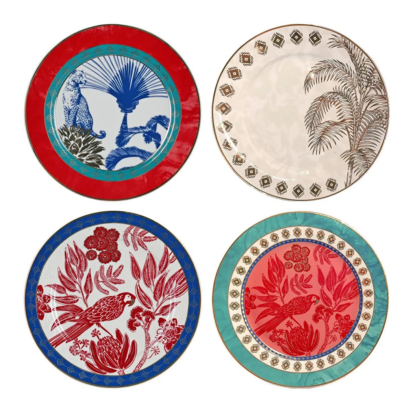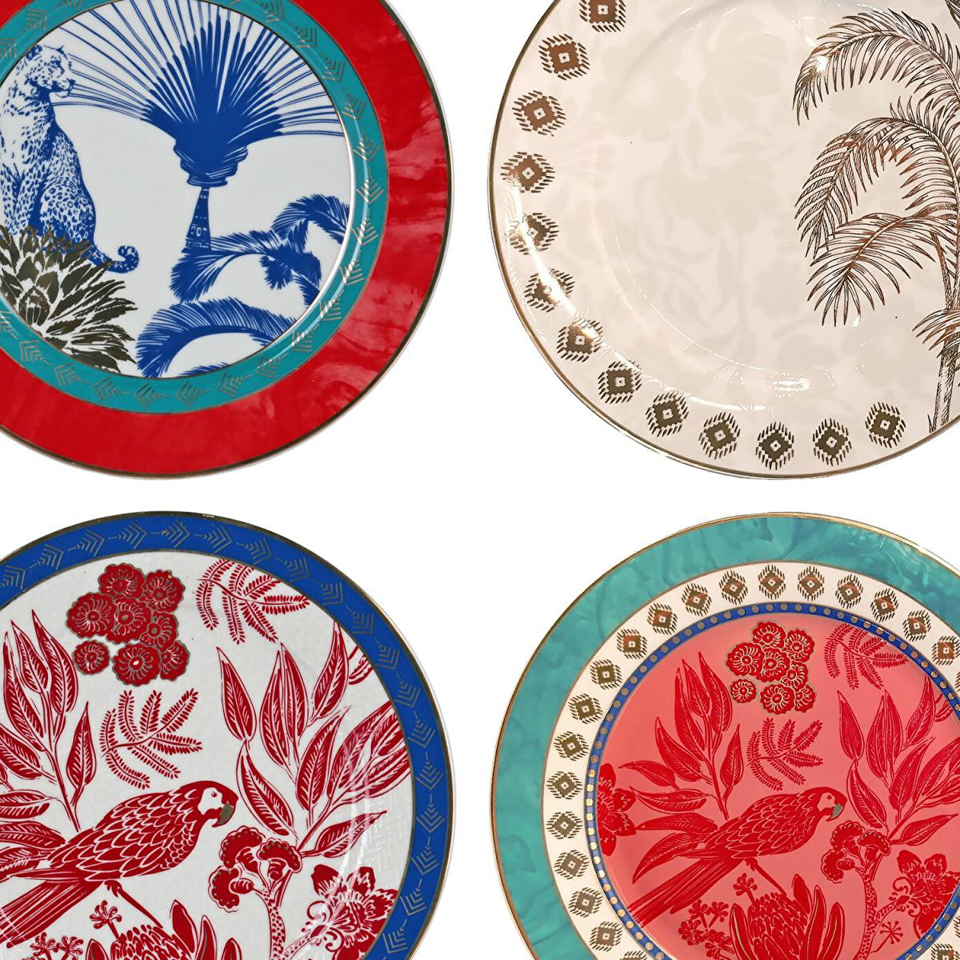 Zengin ve Estetik Tasarım: Set; kırmızı, turkuaz, lacivert ve bej tonlarındaki canlı çerçevelerle sarmalanmış 4 farklı tropikal desenden oluşmaktadır.